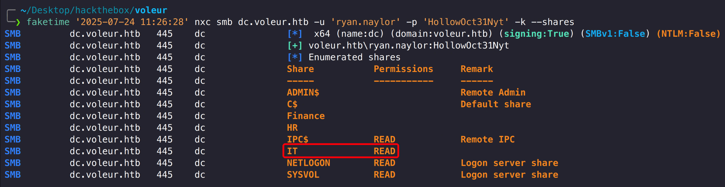 1 faketime '2025-07-24 11:26:28' nxc smb dc.voleur.htb -u 'ryan.naylor' -p 'HollowOct31Nyt' -k --shares