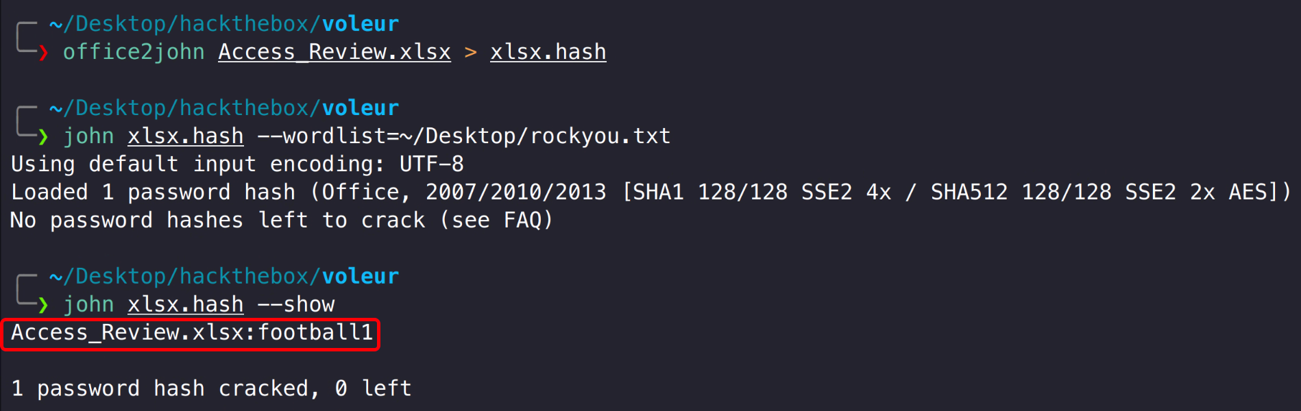 1 2 office2john Access_Review.xlsx > xlsx.hash john xlsx.hash --wordlist=~/Desktop/rockyou.txt