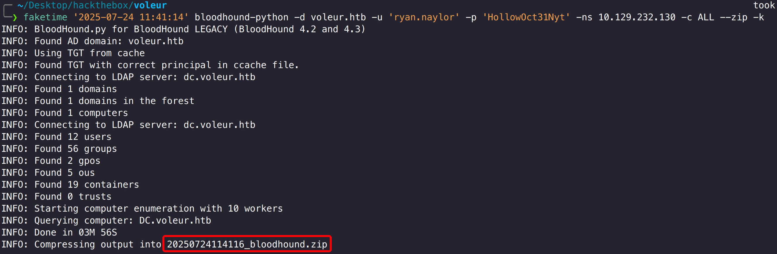 1 faketime '2025-07-24 11:41:14' bloodhound-python -d voleur.htb -u 'ryan.naylor' -p 'HollowOct31Nyt' -ns 10.129.232.130 -c ALL --zip -k