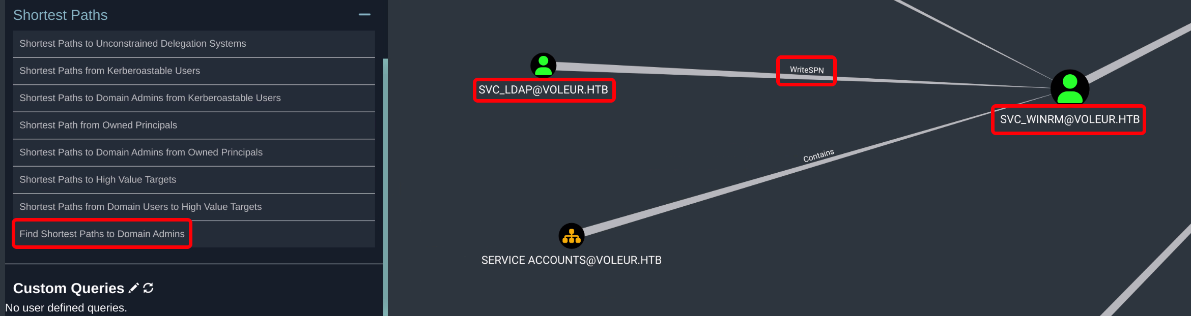 bloodhound 查看通往 domain admin 最短路径,发现 svc_ldap 对 svc_winrm 用户具有 writesSPN 权限,且 svc_winrm 用户对 DC 具有远程管理权限。