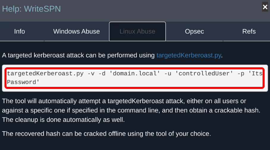 右键 writesSPN 查看攻击帮助信息,发现可通过 targetedKerberoast 工具执行获取 TGS_REP 认证包。