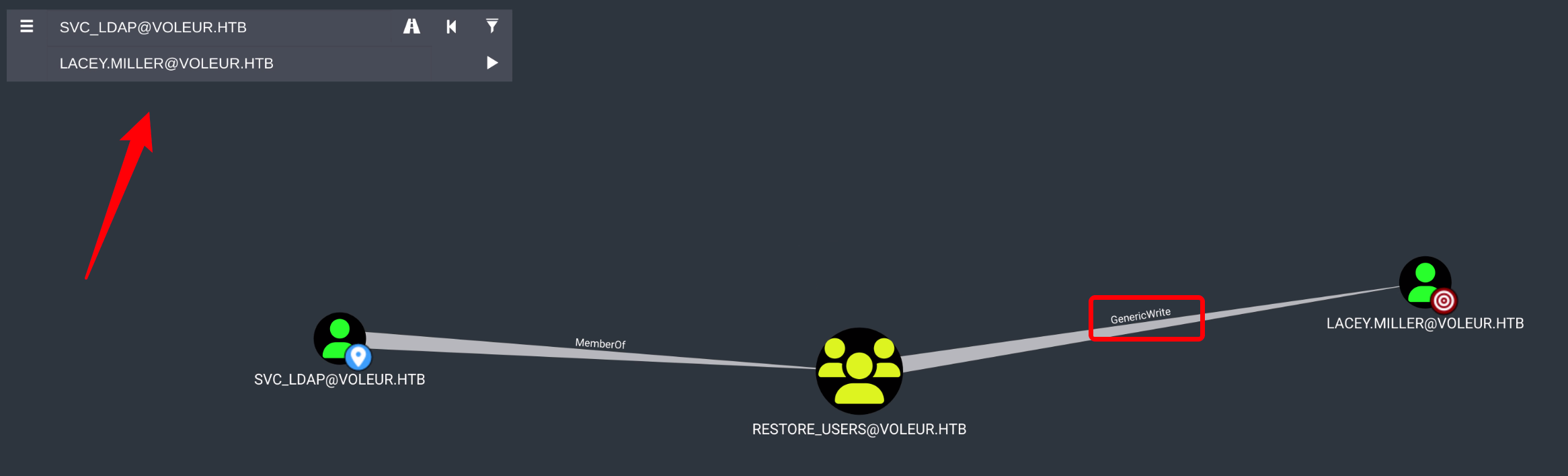 bloodhound 检索发现 svc_ldap 用户对 Lacey.Miller 用户具有 GenericWrite 权限,可通过影子攻击获取 Lacey.Miller 用户 hash,利用 pyWhisker 工具未能攻击成功。** 注意:** 对于这条攻击思路可查看用户出站权限得知。