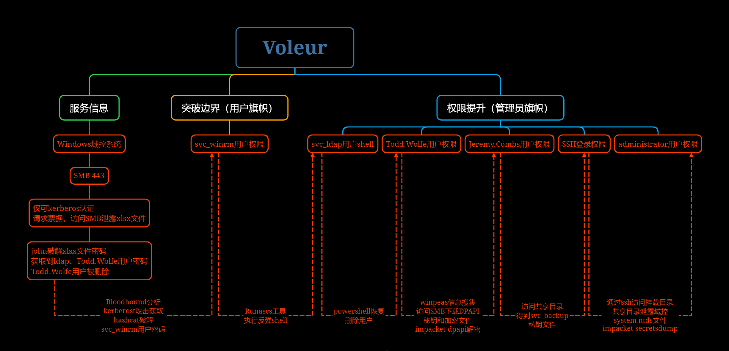 利用获取的 svc_winrm 用户 shell,执行 Runascs 工具反弹 shell(svc_ldap 用户权限),然后通过获取的 shell 恢复了 Todd.Wolfe 用户。再次执行执行 Runascs 工具反弹 shell,获取到 Todd.Wolfe 用户 shell,使用 winpeas 工具信息搜集,发现 Todd.Wolfe 用户家目录存在 DPAPI 文件,以 Todd.Wolfe 用户权限连接靶机 SMB 服务,其服务共享了 Todd.Wolfe 用户家目录,通过检索在家目录得到了加密的 master key 和用户凭证文件,使用 impacket-dpapi 工具解密得到了 Jeremy.Combs 用户凭证。使用 Jeremy.Combs 用户访问靶机 SMB 服务得到了 SSH 私钥文件,使用 svc_backup 用户成功登录靶机 WSL 系统。系统 mnt 目录挂载了靶机 C 盘文件,在 IT 共享目录发现了域控备份的 system 和 ntds 文件,使用 impacket-secretsdump 工具得到了域控管理员 hash,使用 evil-winrm 登录,在 administrator 桌面得到管理员旗帜。