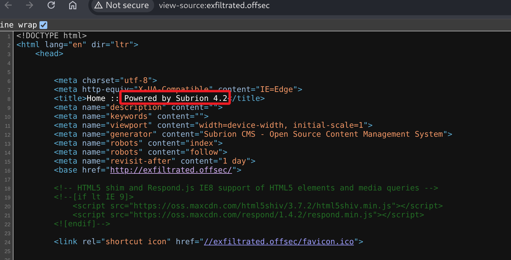 访问靶机 HTTP 服务,查看网页源代码得知系统为 Subrion CMS 4.2。