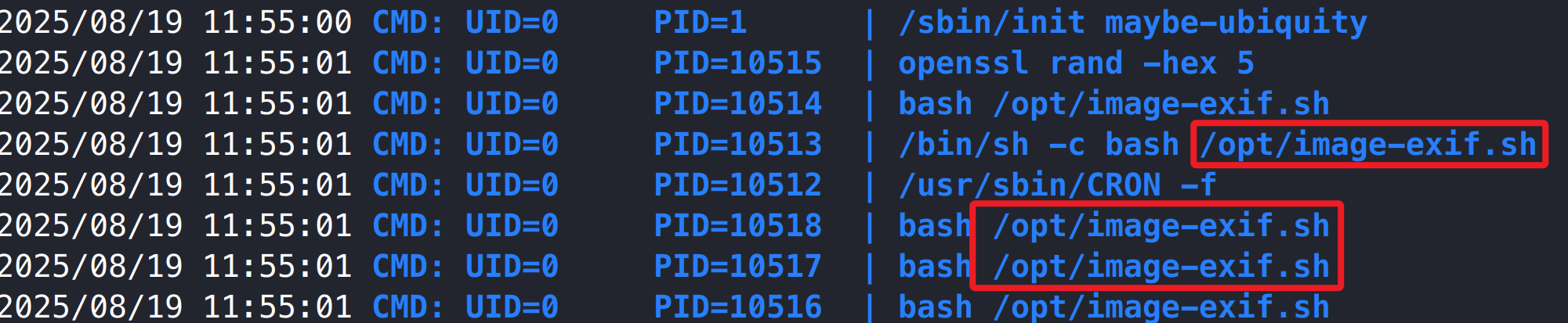 上传 pspy 工具,发现系统会定时以 root 权限执行/opt/image-exif.sh 脚本。