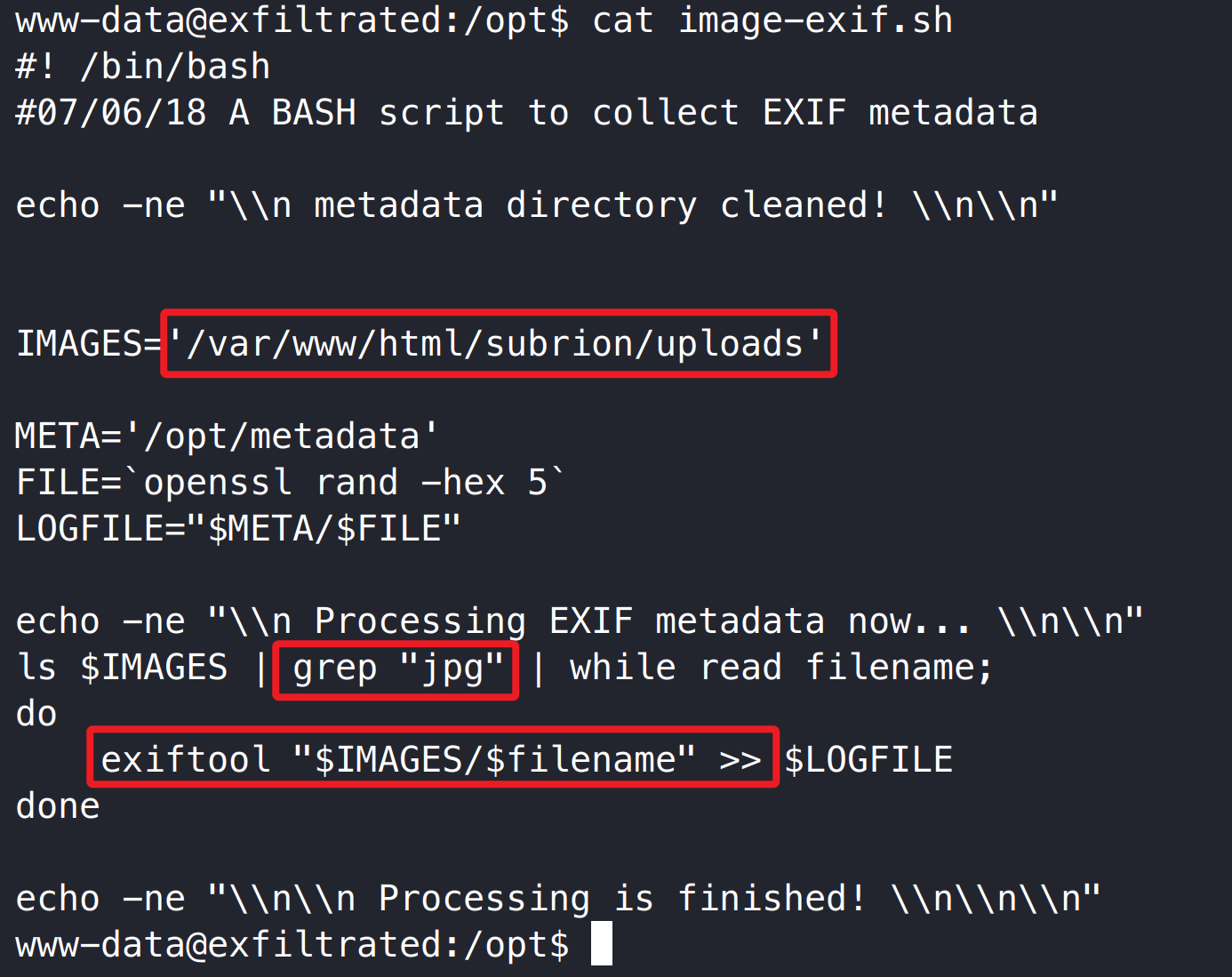 脚本中使用了 exiftool 工具处理/var/www/html/subrion/uploads 目录 jpg 图片。