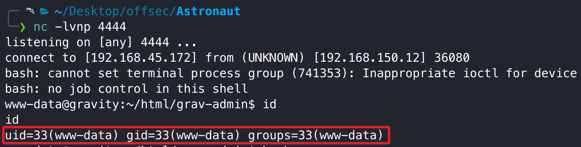 在 kali 使用 nc 监听 4444 端口,然后执行漏洞利用代码,成功获取系统 www-data 用户权限 shell,注意: 如若执行一次未成功,需检查脚本反弹 shell Payload 和 URL,再次执行。