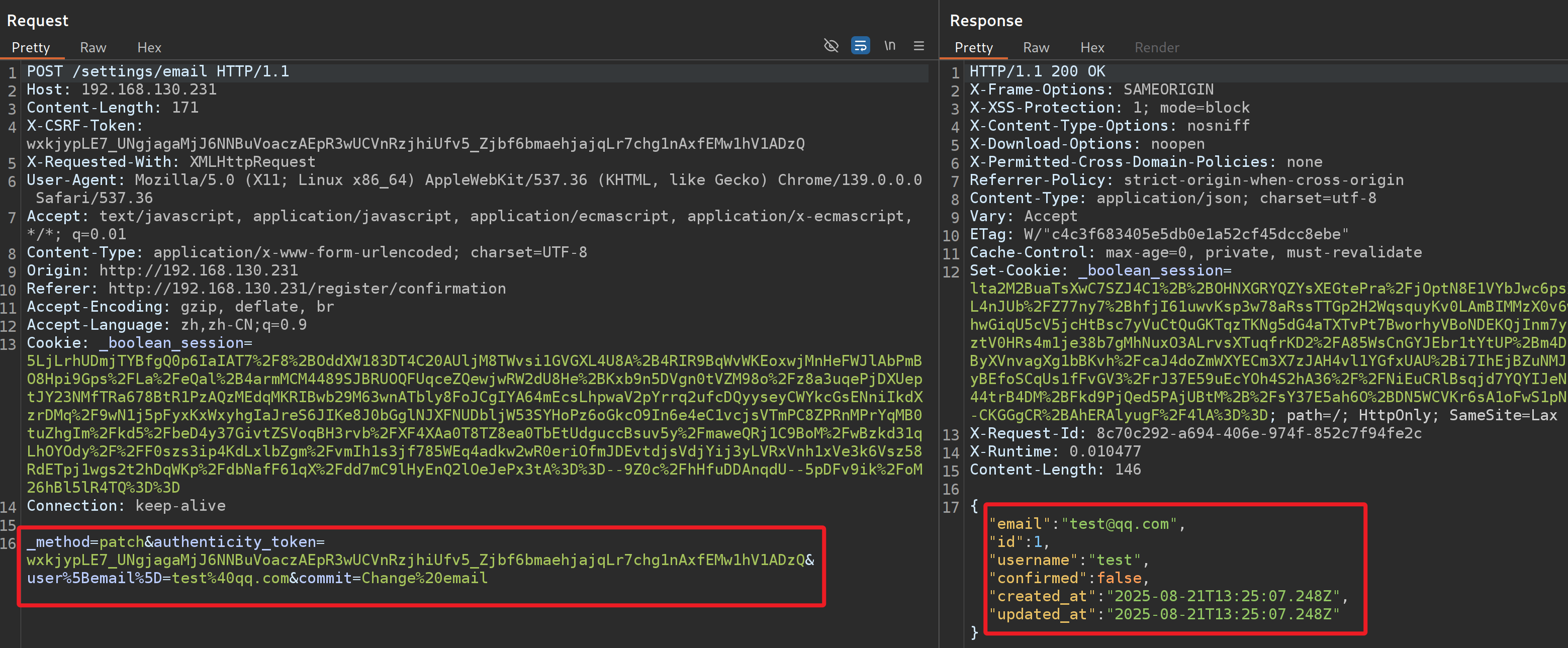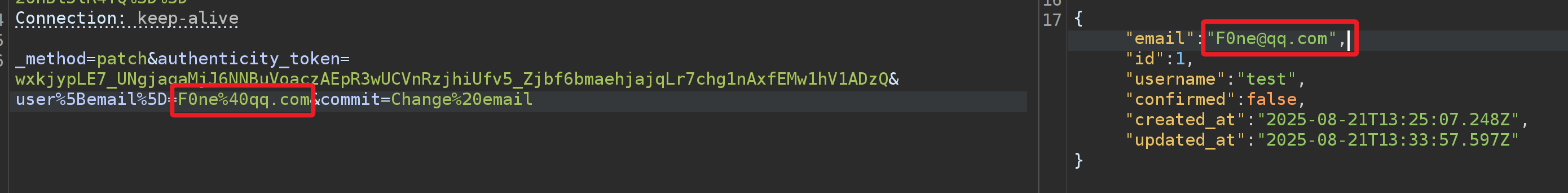 响应体除了 email 参数还存在 confirmed 参数,而该字段中文为确认的意思,尝试在请求体修改该参数为 true,结果成功修改。