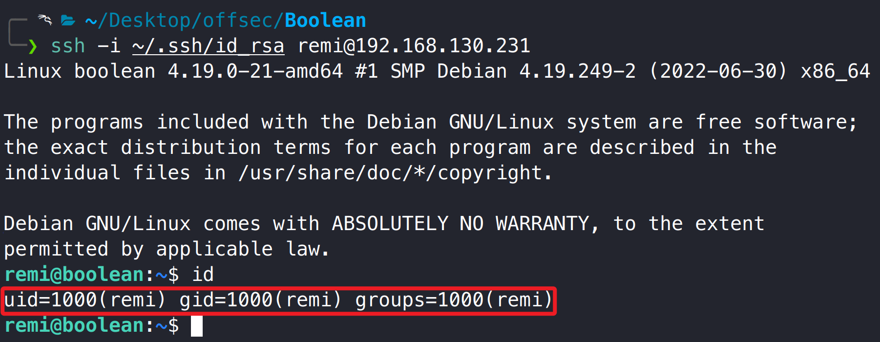 使用 kali 私钥文件连接靶机,得到系统 remi 用户 shell。