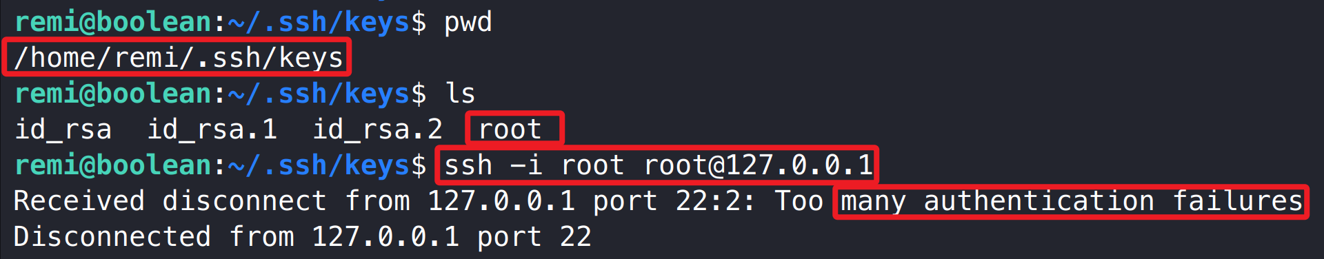 靶机系统信息搜集过程中,在 remi 用户.ssh/keys 目录发现了私钥文件,利用该私钥文件 ssh 连接靶机,系统提示因尝试次数太多而拒绝连接。