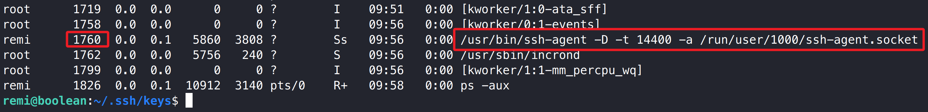 使用 ps -aux 发现 ssh-agent 进程非常可疑,使用 kill -9 将其结束,再次执行发现进程依然存在。
