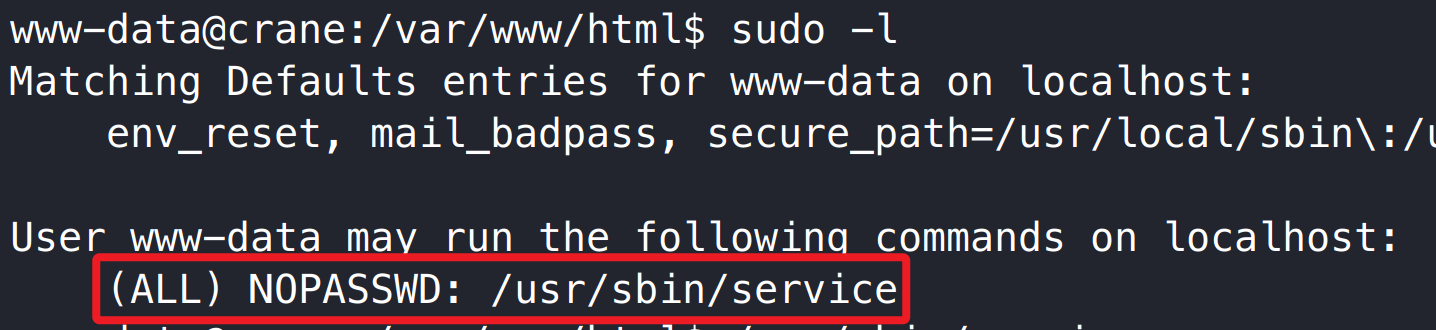 查看系统 sudo 权限时,发现 www-data 用户可通过任意用户权限执行 service 命令,利用该配置可提权至系统 root 权限。