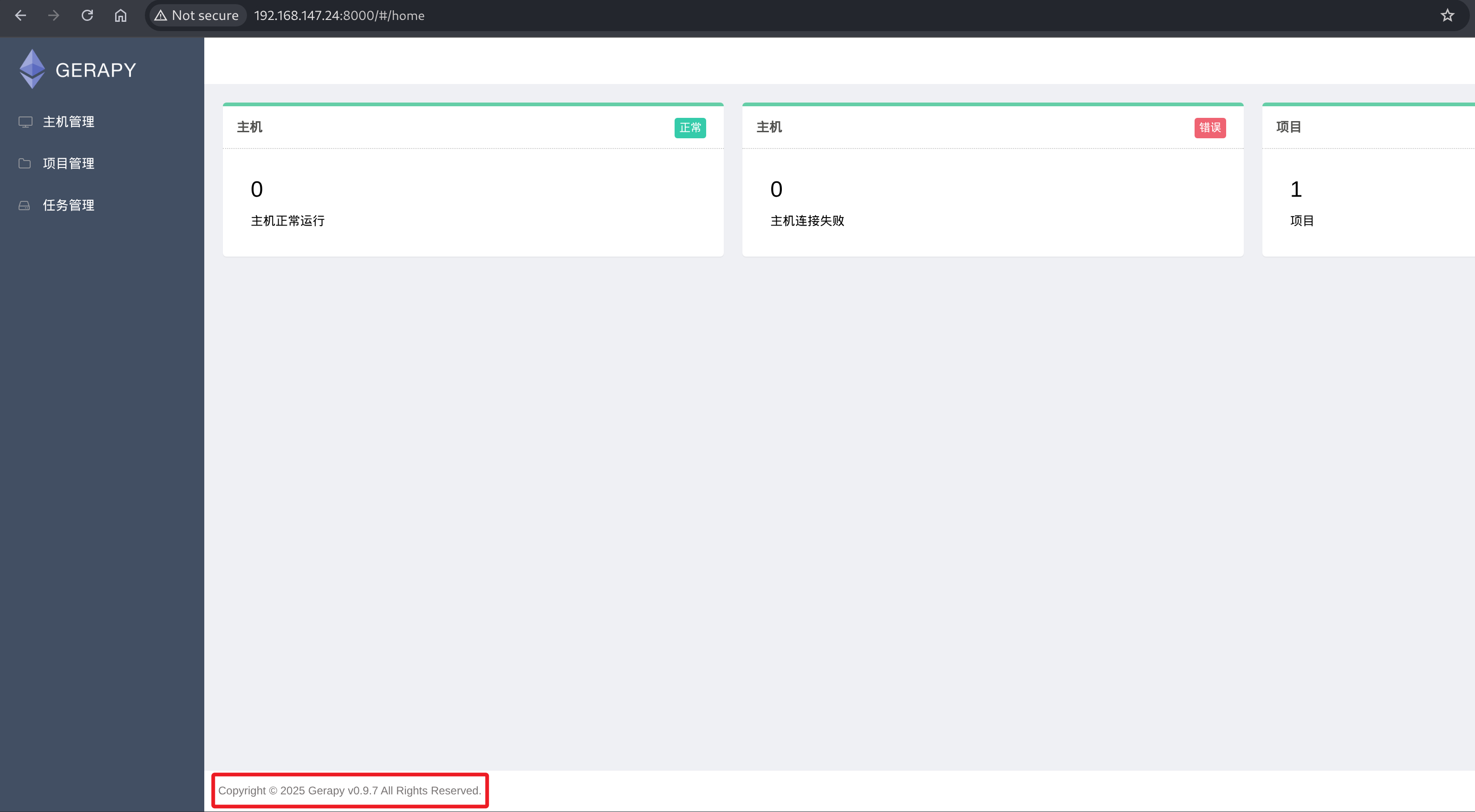 访问系统 HTTP 8000 端口,利用弱口令可成功登录后台,在后台发现该应用为 Gerapy v0.9.7。