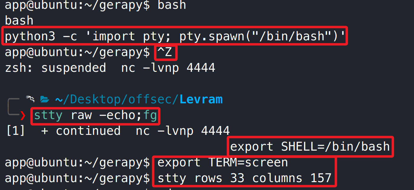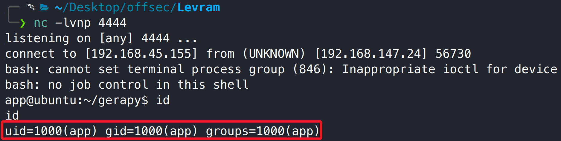 复制 py 脚本至当前目录,kali 使用 nc 监听 4444 端口,执行漏洞利用脚本获取到系统 app 用户 shell。
