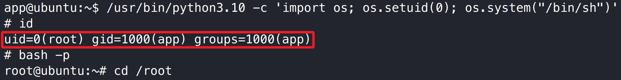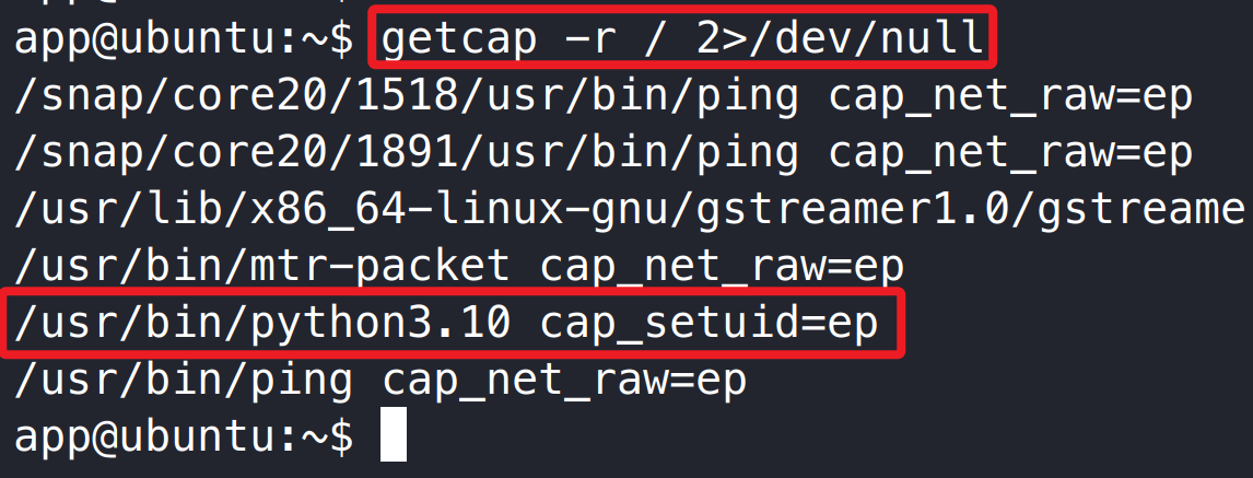 使用 linpeas 或通过 getcap 命令可得知系统 Python3.10 具有 cap_setuid 权限,利用该配置可提权至系统 root 权限。