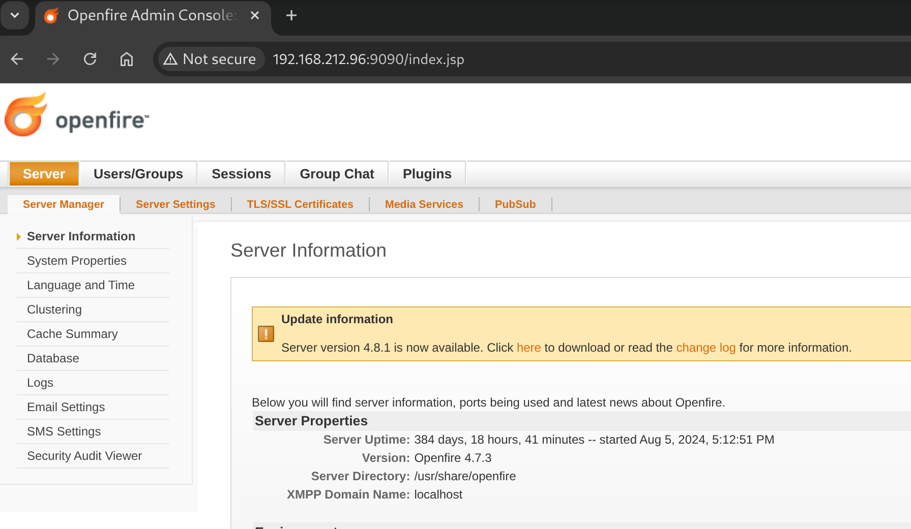 依次访问系统 HTTP 9090、9091 端口,这里两个端口对应的为同一个系统(9091 需使用 https 访问),其中系统前端页面暴露了系统版本信息:Openfire 4.7.3。