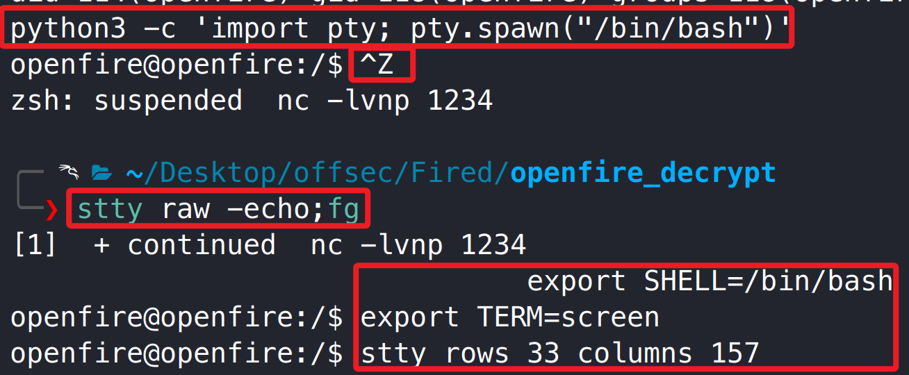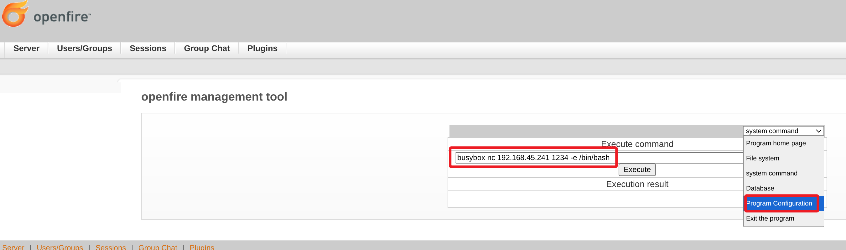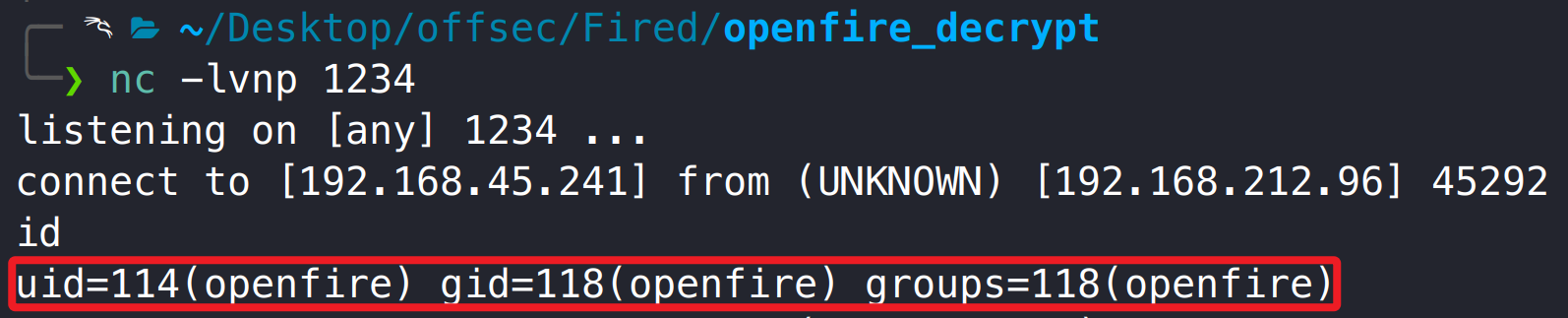 在 kali 使用 nc 监听 1234 端口,使用插件执行反弹 shell,获取到系统 openfire 用户 shell。
