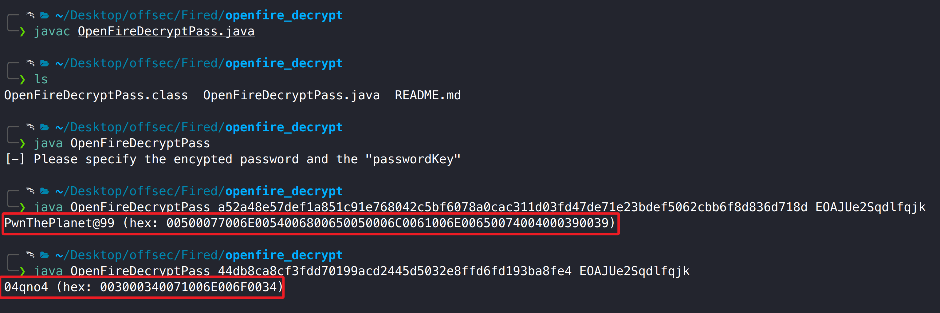 | git clone https://github.com/c0rdis/openfire_decrypt.git sudo apt install default-jdk javac OpenFireDecryptPass.java java OpenFireDecryptPass a52a48e57def1a851c91e768042c5bf6078a0cac311d03fd47de71e23bdef5062cbb6f8d836d718d EOAJUe2Sqdlfqjk java OpenFireDecryptPass 44db8ca8cf3fdd70199acd2445d5032e8ffd6fd193ba8fe4 EOAJUe2Sqdlfqjk