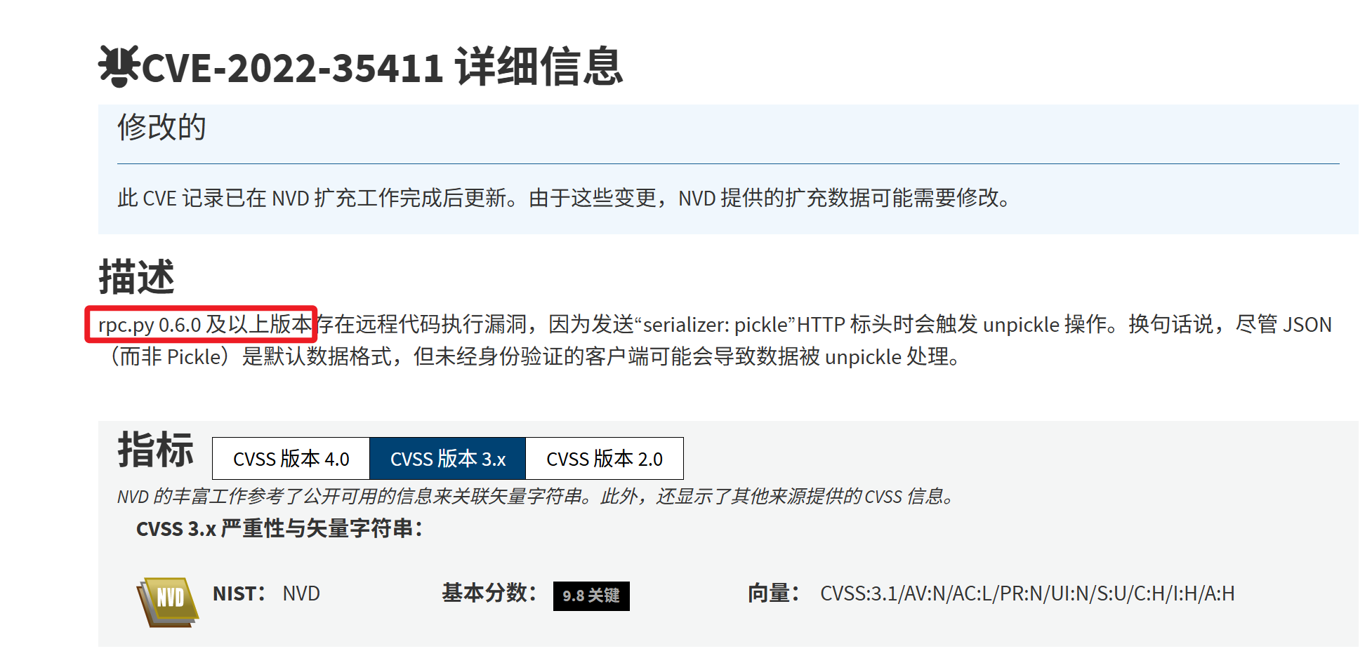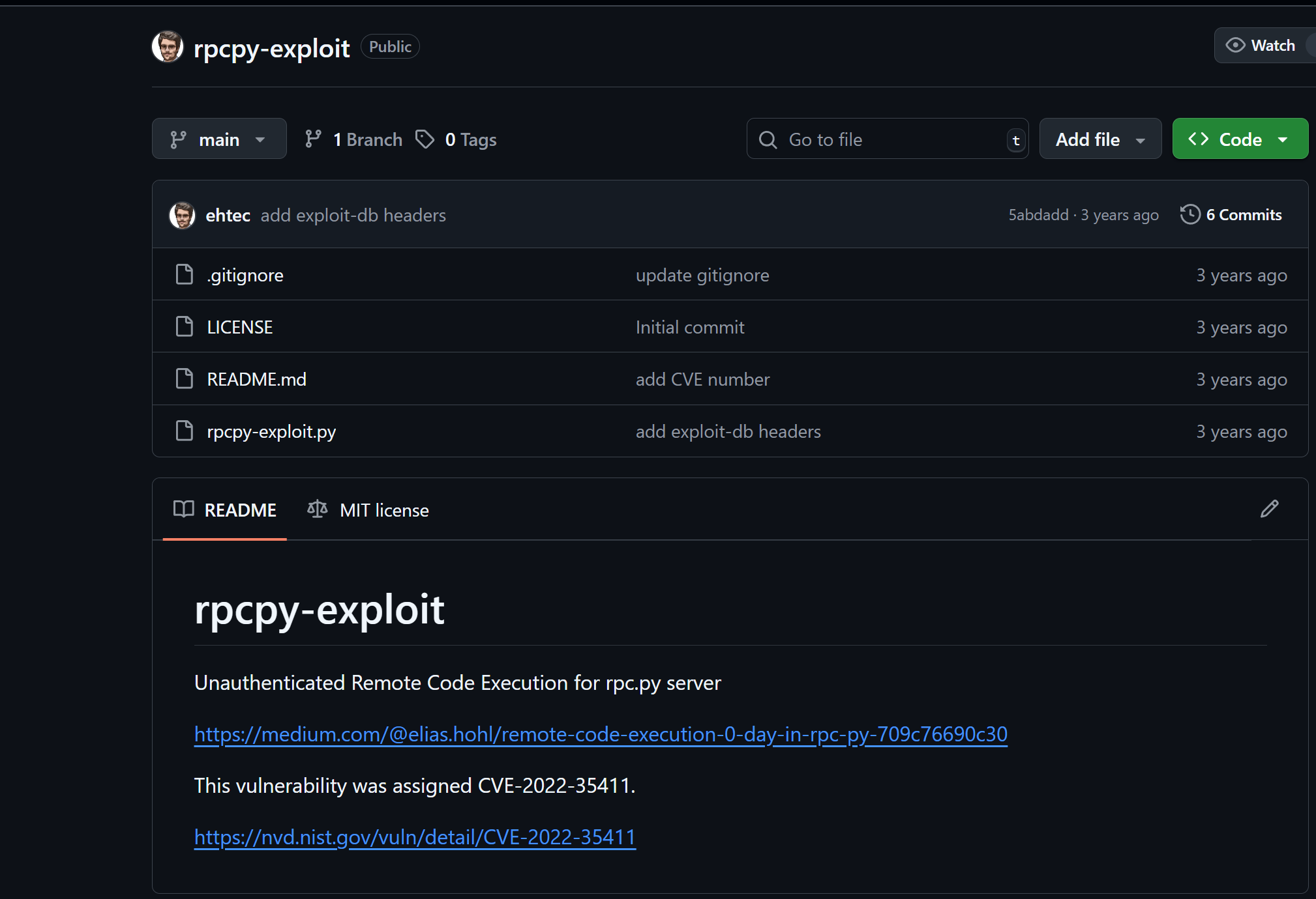 搜索引擎检索 rpc.py exploit,发现该程序可能存在远程代码执行漏洞(CVE-2022-35411),影响版本为 0.6.0 及以上版本。