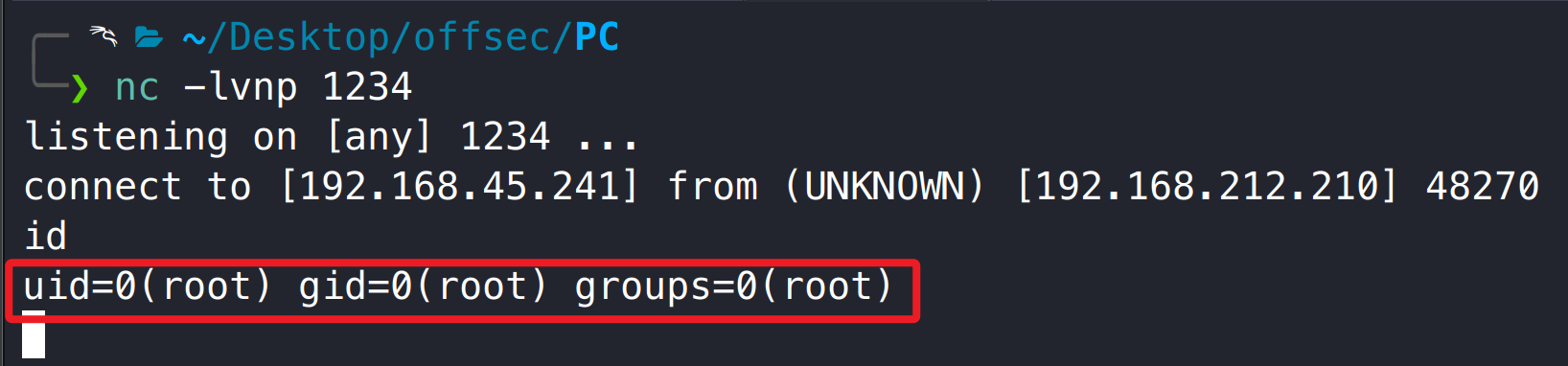 kali 使用 nc 监听 1234 端口,执行漏洞利用脚本,获取到系统 root 用户 shell。