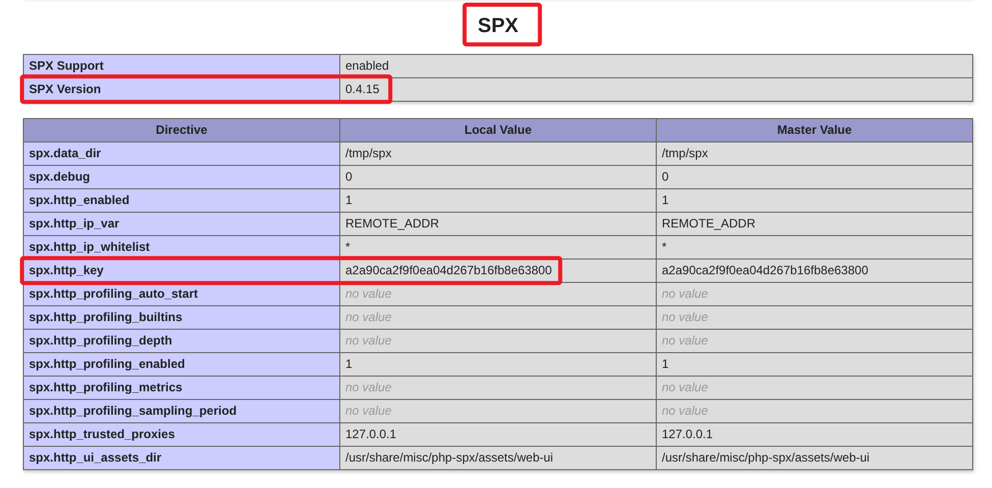 访问 phpinfo.php 文件,在列表发现 SPX 版本号和 key 信息。