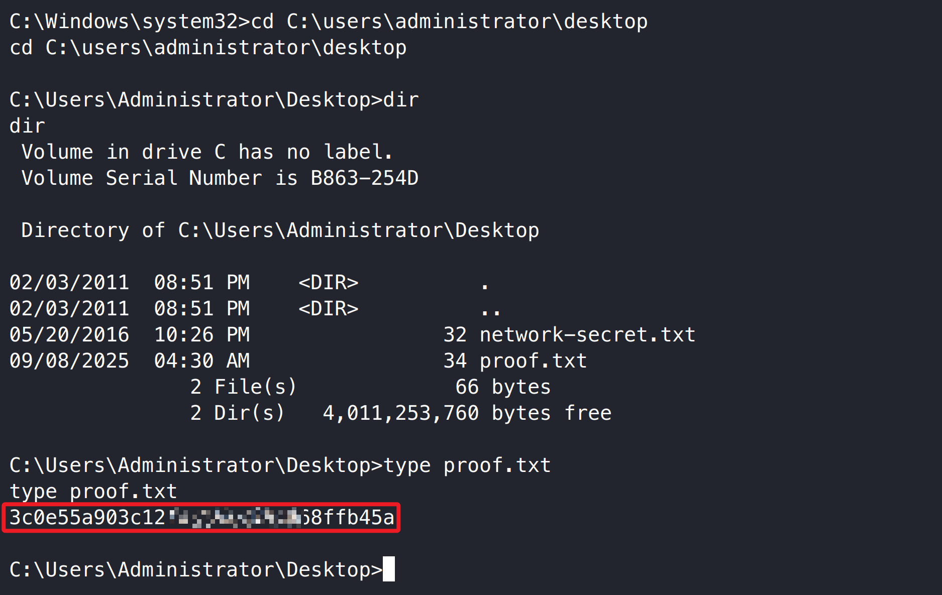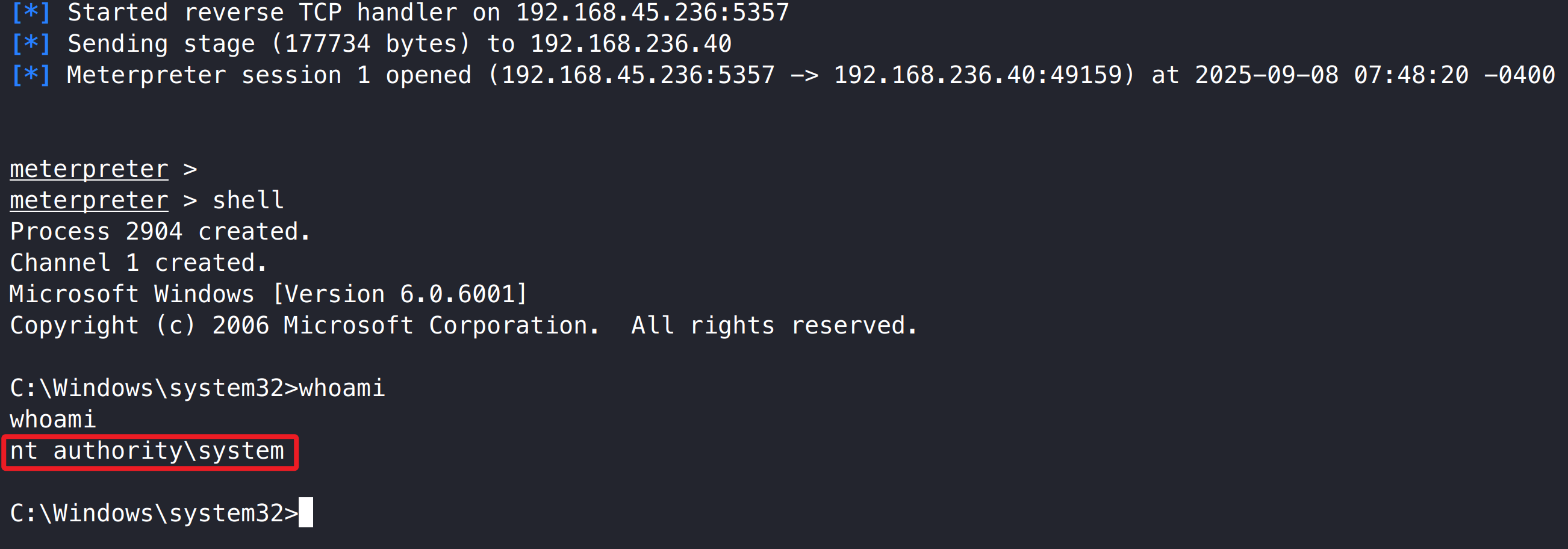 PORT STATE SERVICE VERSION 53/tcp open domain Microsoft DNS 6.0.6001 (17714650) (Windows Server 2008 SP1) | dns-nsid: |_ bind.version: Microsoft DNS 6.0.6001 (17714650) 135/tcp open msrpc Microsoft Windows RPC 139/tcp open netbios-ssn Microsoft Windows netbios-ssn 445/tcp open microsoft-ds Windows Server (R) 2008 Standard 6001 Service Pack 1 microsoft-ds (workgroup: WORKGROUP) 3389/tcp open ms-wbt-server Microsoft Terminal Service |_ssl-date: 2025-09-08T06:36:27+00:00; 0s from scanner time. | rdp-ntlm-info: | Target_Name: INTERNAL | NetBIOS_Domain_Name: INTERNAL | NetBIOS_Computer_Name: INTERNAL | DNS_Domain_Name: internal | DNS_Computer_Name: internal | Product_Version: 6.0.6001 |_ System_Time: 2025-09-08T06:36:18+00:00 | ssl-cert: Subject: commonName=internal | Not valid before: 2025-01-05T19:52:51 |_Not valid after: 2025-07-07T19:52:51 5357/tcp open http Microsoft HTTPAPI httpd 2.0 (SSDP/UPnP) |_http-server-header: Microsoft-HTTPAPI/2.0 |_http-title: Service Unavailable 49152/tcp open msrpc Microsoft Windows RPC 49153/tcp open msrpc Microsoft Windows RPC 49154/tcp open msrpc Microsoft Windows RPC 49155/tcp open msrpc Microsoft Windows RPC 49156/tcp open msrpc Microsoft Windows RPC 49157/tcp open msrpc Microsoft Windows RPC 49158/tcp open msrpc Microsoft Windows RPC Service Info: Host: INTERNAL; OS: Windows; CPE: cpe:/o:microsoft:windows_server_2008::sp1, cpe:/o:microsoft:windows, cpe:/o:microsoft:windows_server_2008:r2