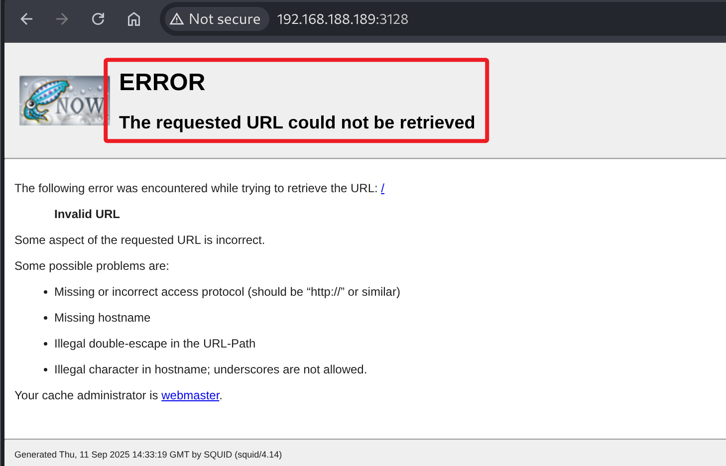 3.2 渗透测试突破边界 3.2.1 Squid 代理转发 测试靶机 SMB、RCP 等服务均没有得到有价值信息,仅剩下 TCP 3128 端口,所以我们只能通过该端口服务获取立足点。信息收集过程 nmap 识别到应用为:Squid 4.14,检索应用漏洞没有发现可利用的 EXP,尝试浏览器访问该端口,可正常访问。